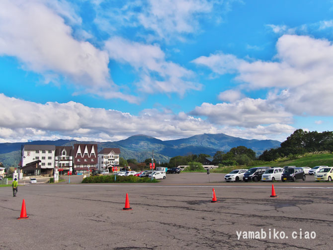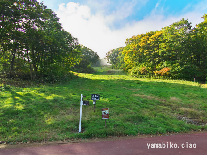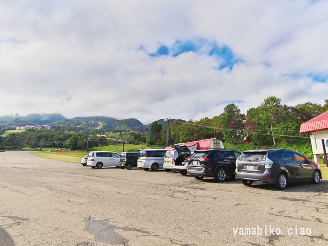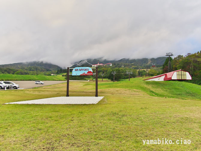 スカイケーブル山麓駅駐車場からの妙高山(雲の中)