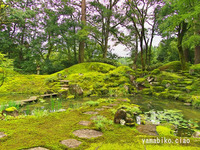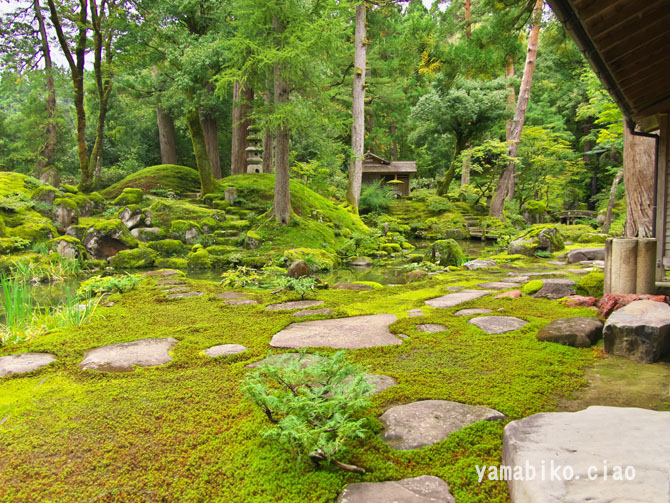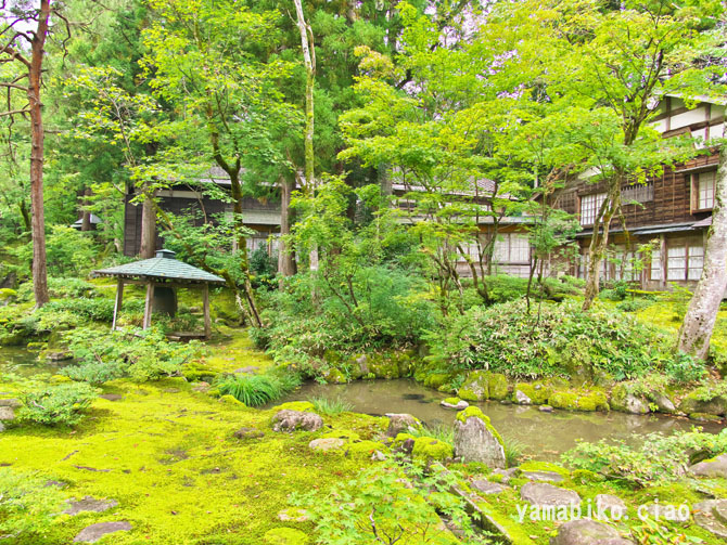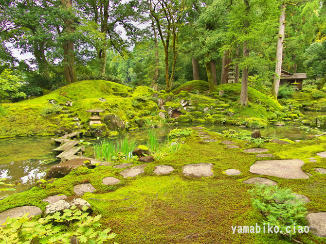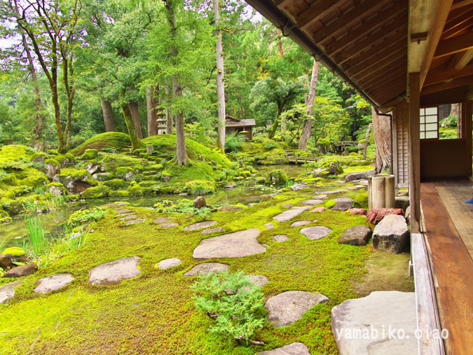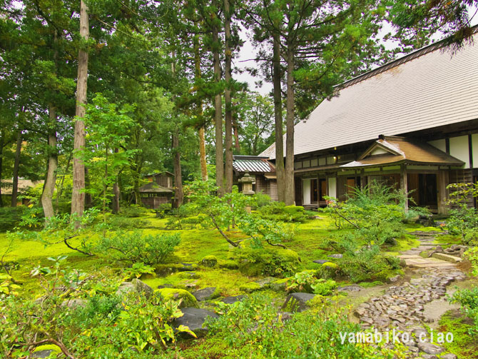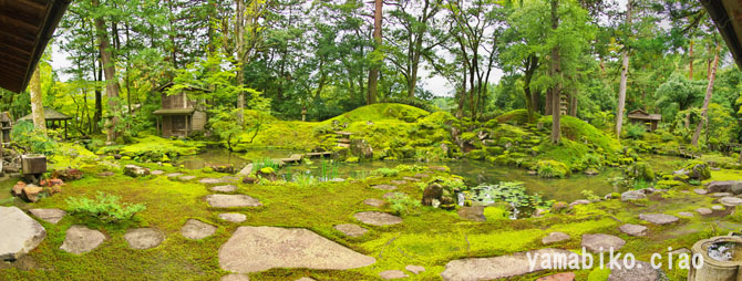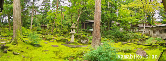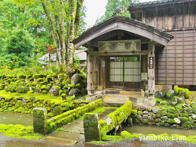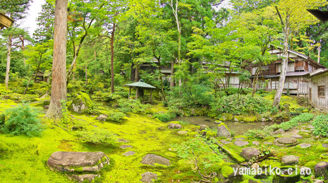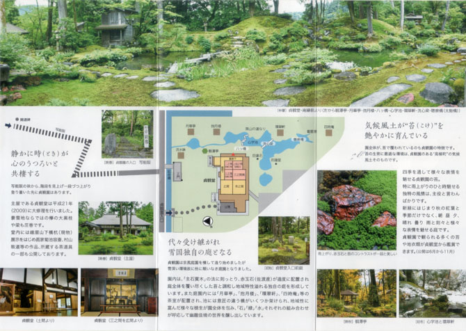 概要 貞観園は、豪農だった村山氏が現在地に移り住み、延宝元年(1673)から造園を開始してから、代々の当主が作庭を続けた大庭園です。江戸幕府の庭師:九段仁右衛門、藤井友之進や茶人:松村宗悦、裏千家玄々斎など、作庭師だけでなく茶人や文化人も携わったと言われています。その後、幾度となく手を加えられ、明治初期に現在の姿になったといわれています。名前の由来は、木造薬師如来立像を安置する貞観堂に因み、天保14年(1843)に地元の教育者:藍澤南城が命名しました。主石賓木(石が主役で、木が脇役)という思想に則った庭園で、青く苔生した石が特徴的で、落ち着いた様相を見せています。庭園内には、貞観堂のほかに、観瀑亭、四時庵、抱月楼、環水軒などの茶室が見られます。また、100種以上の苔が生育する苔庭です。雪深い山奥で、静寂とかすかな水音に包まれて観賞できる庭園で、昭和12年(1973)に国指定名勝に指定。 |