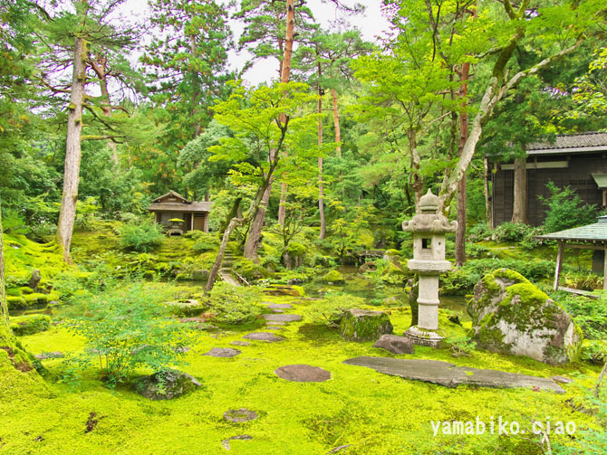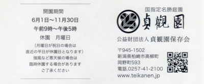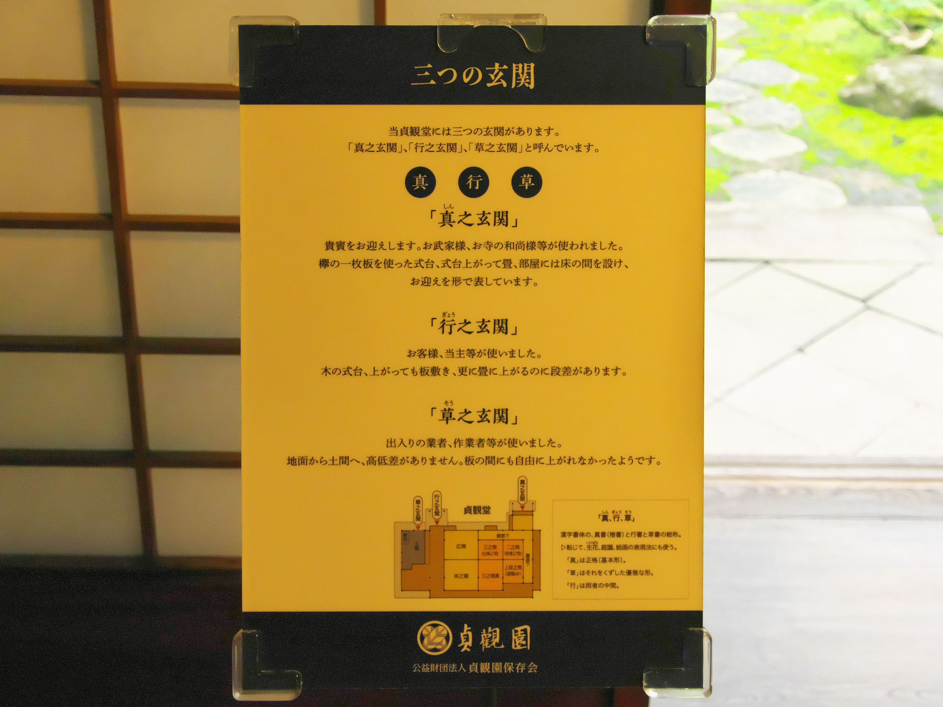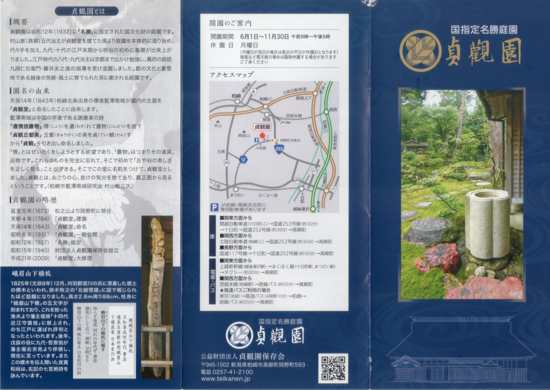 現在、貞観園保存会により大切に管理、保存されています。主屋の「貞観堂」は、平成20年(2008)に大修理を終え、園内の茶室も平成26年(2014)に修理事業が終了しました。また、令和元年(2019)までに道路を挟んだ場所にある南苑が整備されています。庭園内を覆う苔の保護のため、公開エリアは貞観堂と貞観堂からの庭園鑑賞に制限されていますが、襖絵などの多くの文化財もあり、ゆっくり見学できます。昭和7年(1932)に、田中泰阿弥により修復。裏手の山より、地域の水田へ引いた疎水の一部を庭園に引き込み、二つの滝、池を配した池泉回遊式庭園です。自然の地形や水、背後の森を生かし、また雪に強い樹種選定により冬季の雪吊りも最小限にとどめ、自然と庭園造形がみごとに融合した名園です。