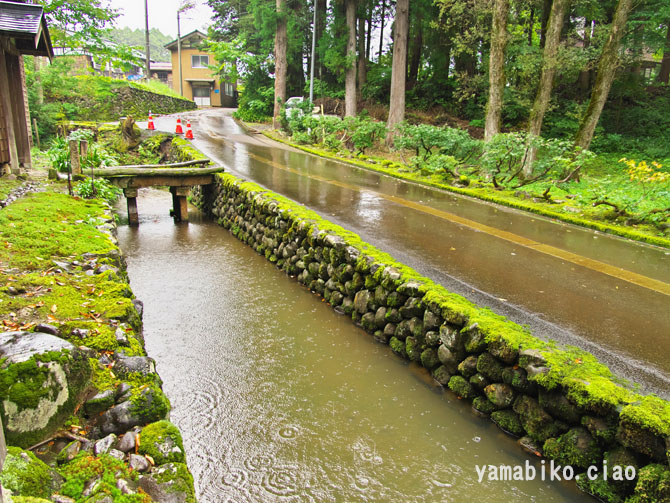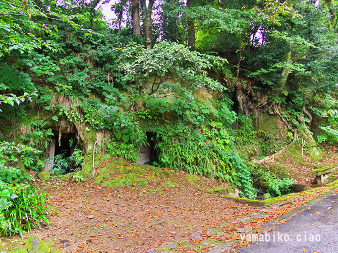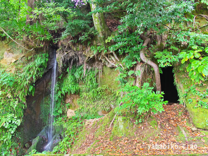 参道にある滝と食料保管窟(砂岩で掘やすいとのこと)