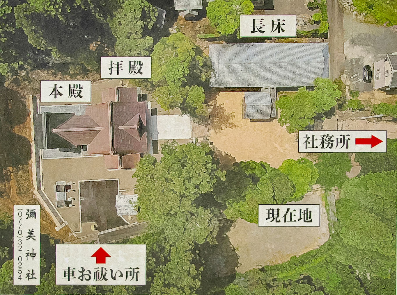 概要 彌美神社は、祭神:室毘古王(むろひこのみこ)、合祀:建御雷神(たけみかづちのかみ)・天兒屋根命(あまのこやねのみこと)・布都主神(ふつぬしのかみ)・比淘蜷_(ひめのおおかみ)・大山祇命(おおやまづみのみこと)、社格:県社、境内社:二十八所社・天満社、本殿の様式:流造り覆屋覆壁付。彌美神社は、江戸時代まで「二十八所大明神」と呼ばれていましたが、明治2年(1869)に「彌美神社」と復称して現在に至っています。神社は、長い参道があり、境内から西側約750mに社号碑が建っているなど、広い信仰が窺われます。また、古くから領家・国主・武家の崇敬も厚く、小浜藩主の酒井正勝が京極忠高が崇敬しています。何でもご利益があるとされ「全ての願いが叶う神社」とも言われています。5月1日の例大祭で奉納される「王の舞」は、福井県の無形民俗文化財に指定されています。神宮寺として園林寺が隣接しています。 |