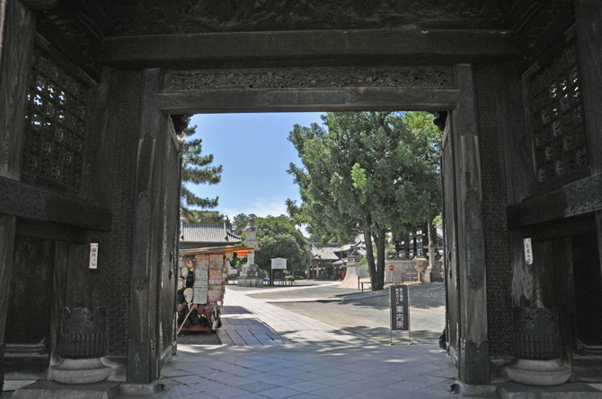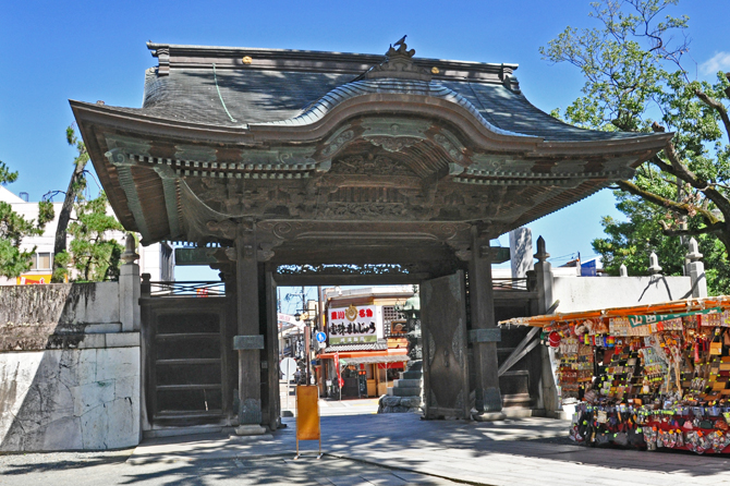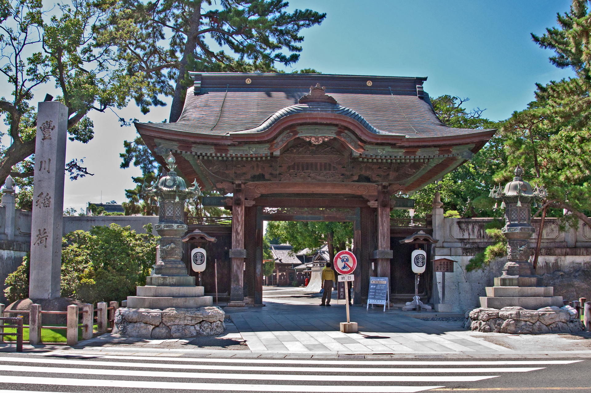 | 概 要 | 曹洞宗の寺院。詳しくは「円福山 豊川閣 妙厳寺」(えんぷくざん とよかわかく みょうごんじ)と称する寺院です。本尊は千手観音。嘉吉元年(1441)、曹洞宗法王派の東海義易によって創建。室町時代末期、今川義元が伽藍を整備。当時は、豊川(河川名)の近くに広がる円福ヶ丘という高台に伽藍があったが、元禄年間までに現在地に移転。現存する諸堂は江戸時代末期から近代の再建です。境内にある稲荷堂が有名なため、一般には「豊川稲荷」の名で広く知られる。 この総門は当寺の創立から214年後の明暦二年(1656)に一度改築されました。 その後数回の改復を重ね、現在の門は明治17年(1884)4月18日、当寺29世黙堂禅師(もくどうぜんじ)によって上棟改築されたものです。門扉及び両袖の扉は千有余年の樹齢を重ねた高さ4.5m、幅1.8m、厚さ15cmの欅の一枚板だそうです。 |