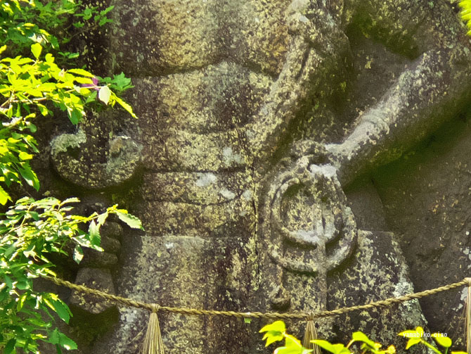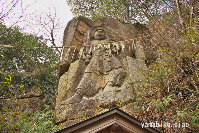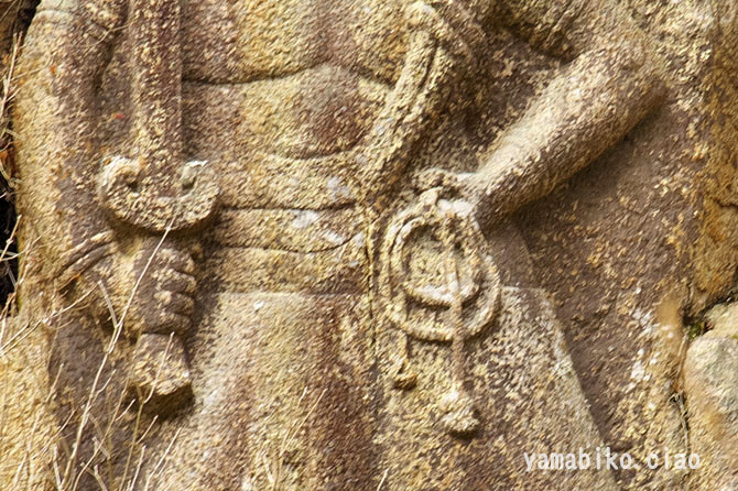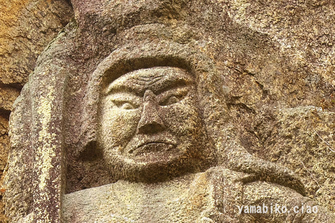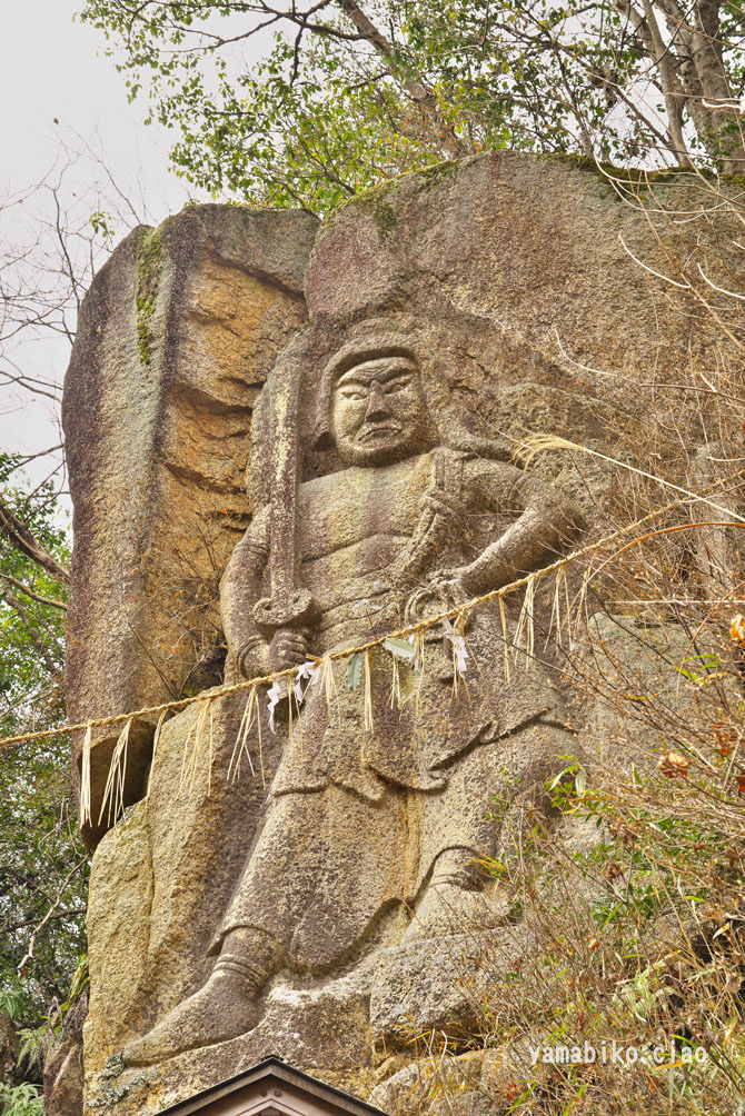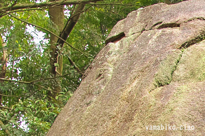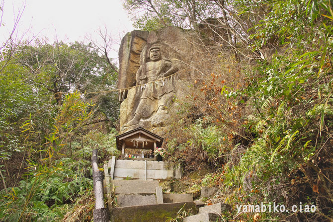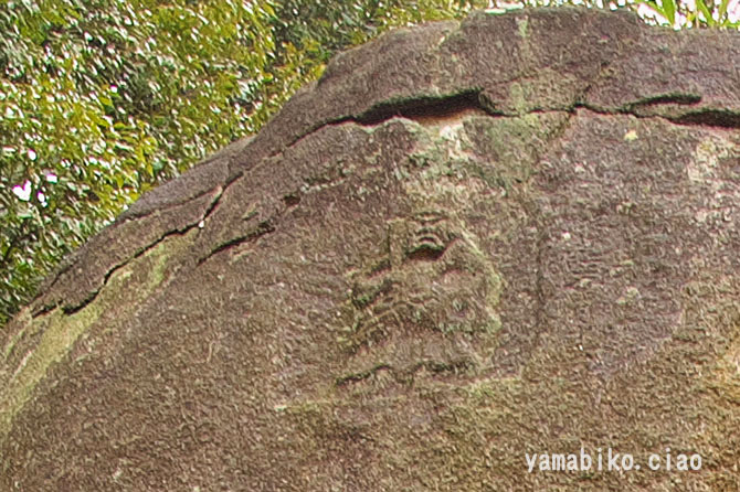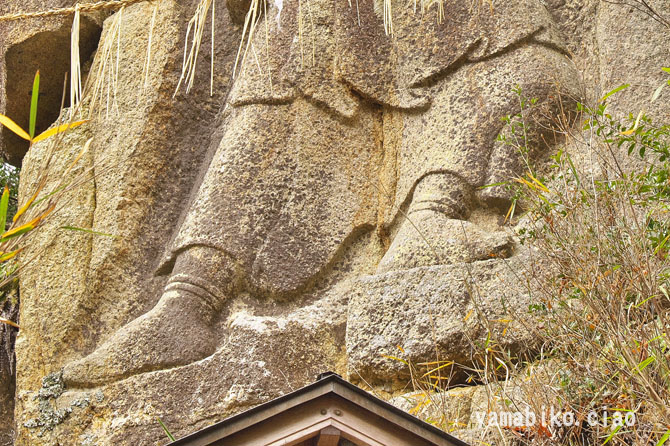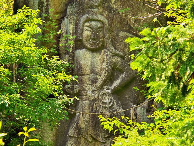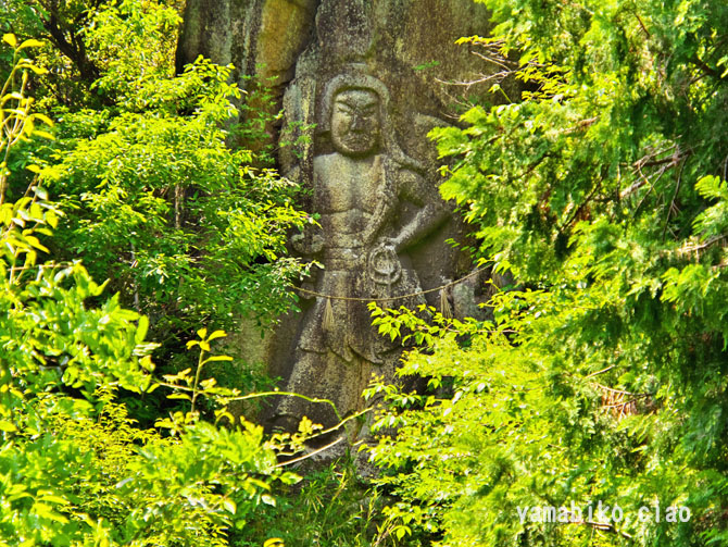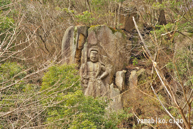 | 地 域 | 25e:野洲/南東S | 概要 車谷不動(通称、摩崖不動明王尊)は、野洲川北岸に位置する摩崖仏で、岩根花園集落から岩根山に登る中腹に、渓流を見下ろすようにそそり立つ巨像で、この地区最大の規模を誇ります。高さ6.20m、巾1.98mの岩に彫られている摩崖仏で、右手には長さ2.30mの宝剣を持って立っています。現在は落石のため、川を渡って間近にまで近寄ることはできません。川を隔てた道からは遥拝できます。十二坊は岩根山とも呼ばれる里山で、かつて、この一帯は、仏教修行の道場として栄えていたといわれています。山名は、薬師如来を守護する十二武神にちなんで十二の坊舎が建てられたことによる ものだろうと考えられています。現在は、十二坊の跡は見られません。この不動明王は、修験者の信仰との関係があったようです。こうした摩崖仏の多くは、水にかかわるところで多くみられるようで、水の恵みへの「崇める」気持ちかもしれません。 | |