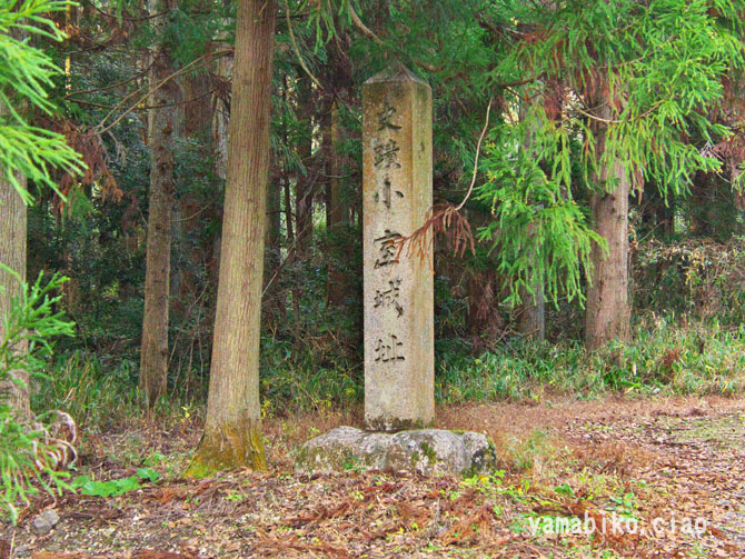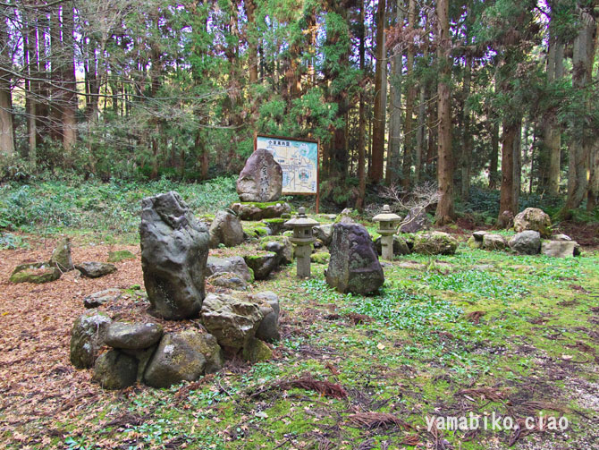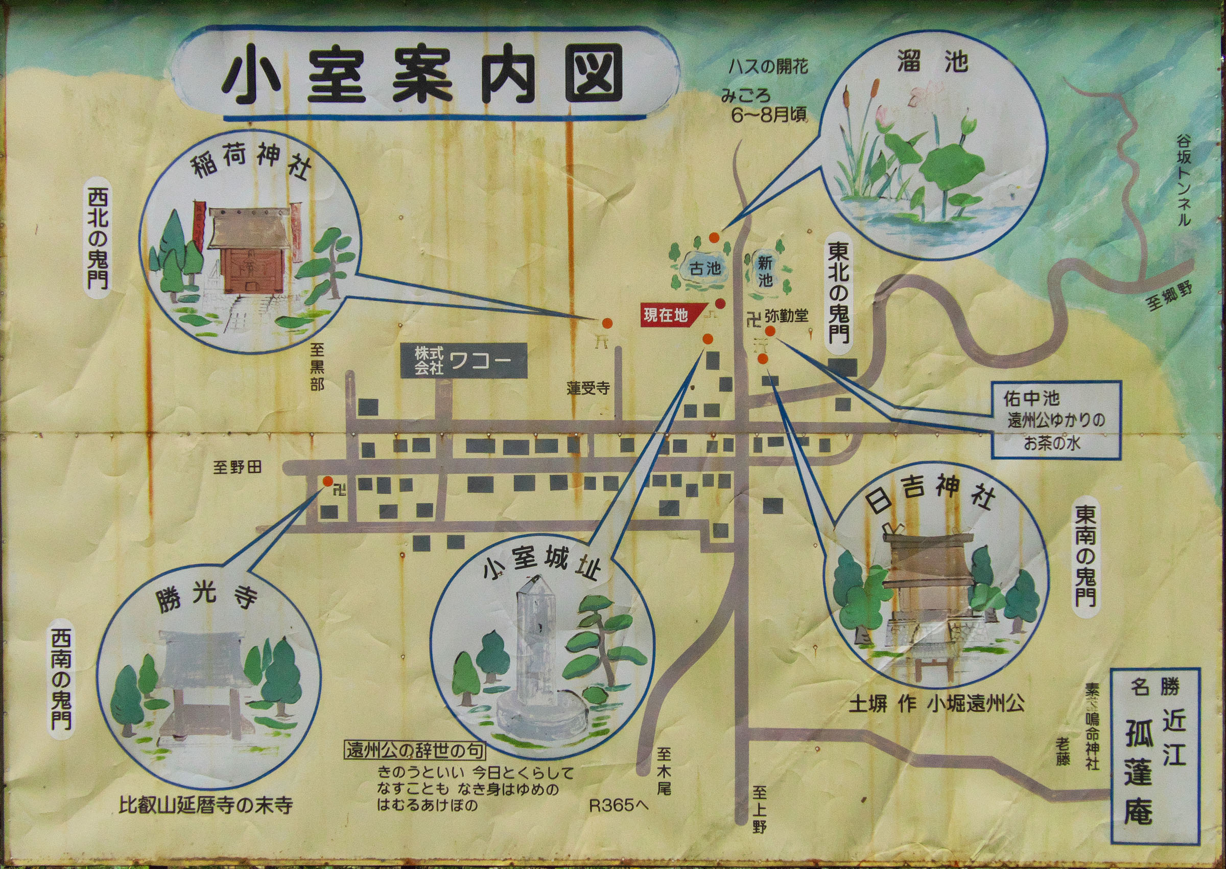概要 正保4年(1647)に千利休・古田織部とともに、三大茶人として、また、江戸幕府の作事奉行をつとめた小堀政一(遠州)の遺領を継いだ政之によって、慶安元年(1648)に築かれた居館です。以後、政恒、政房、政峯、政方と継ぎましたが、天明8年(1788)伏見奉行であった政方のときに改易となりました。小堀家の居館や家臣の住居などは、寛政元年(1789)に大津代官所によって競売、城は廃されまし。同年には、荒地を開墾して畑とするよう命じられました。小室城の規模は比較的大きく、佐治家に伝わる『江州小室御屋敷指図』によると、南を正面として表門があり、その東から東側の表門にかけて長屋が鉤形に設けられ、北側は山に面し、西側と南側の西半は築地塀により囲まれていたようです。この中に屋敷と、馬場・蔵などが建っており、他に二つのお茶屋が存在していました。この居館の外側部の西側と南側に家臣の屋敷が居館をとりまくように並んでいました。 |