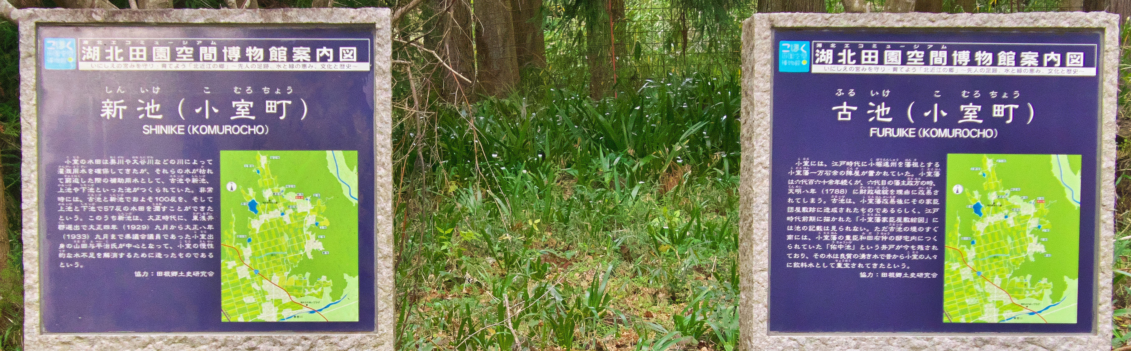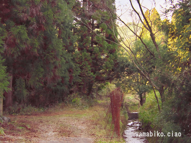陣屋東側水路、林の切れた向うに「新池」「古池」があります