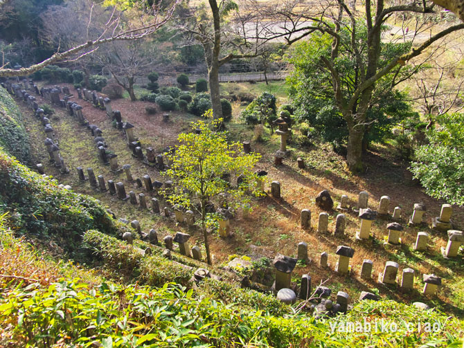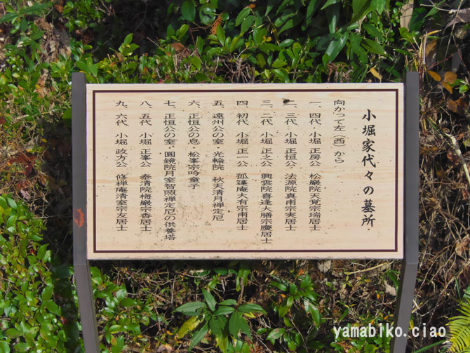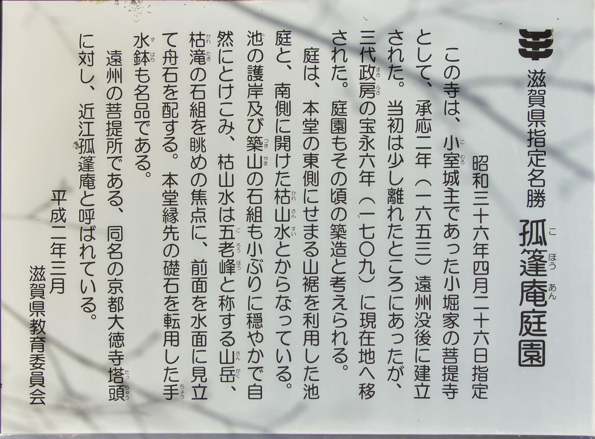 | 地 域 | 25n:虎御前山/南東NW | 概要 小室(こむろ)城主で、千利休、古田織部とともに日本三大茶人としても名高い小堀遠州(1579-1647、徳川秀忠、家光の茶道師範)の菩提を弔うために、2代目城主宗慶(そうけい)(正之)が、江戸時代前期、京都大徳寺(だいとくじ)から僧円恵を招いて開山した臨済宗大徳寺派の寺。遠州が京都大徳寺に建立した孤篷庵にちなんで、近江孤篷庵としました。小堀家の菩提寺でしたが、江戸時代後期、伏見奉行を勤めていた6代目藩主政方(まさみち)の時に、小堀家改易とともに衰え、明治維新後無住のままに荒廃していました。昭和40年(1965)再建。平成23年(1911)6月に前庭や山門などを改修。庭園は、本堂南にある簡素な石組の枯山水と、東に面した池泉回遊式庭園があり、県の名勝に指定されています。閑散期には拝観閉鎖の期間があるので事前確認が必要です。今回も、閉鎖期間でした。門前で引き返し、小堀家歴代藩主の墓所を回って帰路。 | |