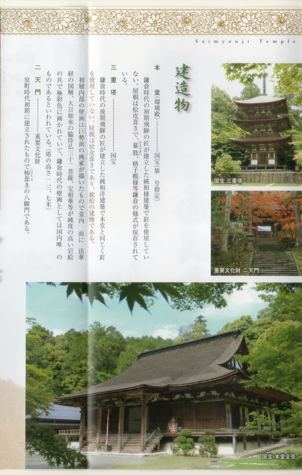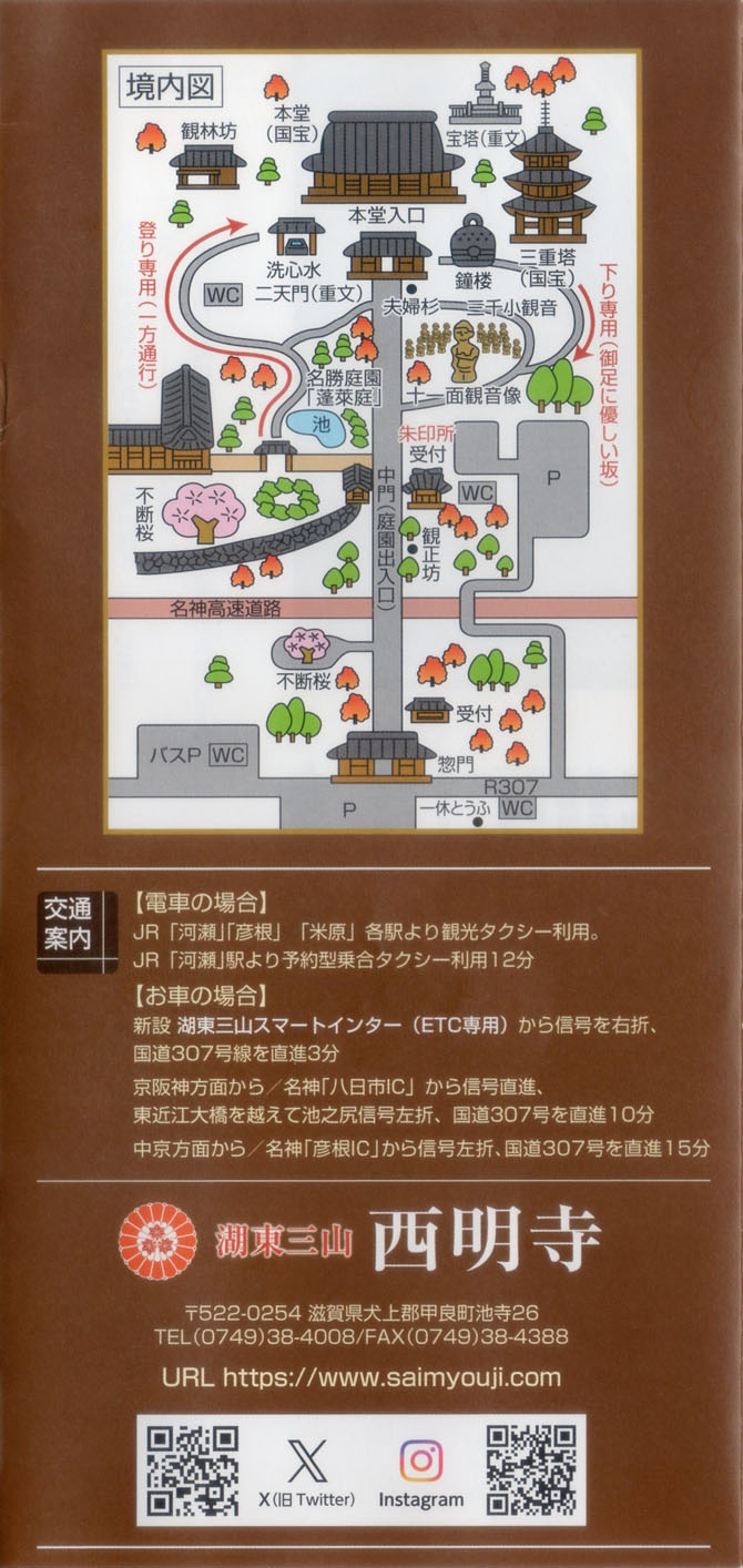 | 地 域 | 25zc:高宮/南西C | 概要 西明寺は、鈴鹿山脈の西山腹に位置する寺院で、湖東三山(西明寺、金剛輪寺、百済寺)の名でも知られ、紅葉の名所です。宗派:天台宗、山号:龍應山、本尊:薬師如来(秘仏:住職一代に一度開扉)、創建年:(伝)平安時代初期、開基:(伝)三修上人。文化財:本堂・三重塔(国宝)、二天門(重文)、薬師如来立像(重文)、他。三修上人は、半ば伝説化した行者です。承和3年(836)には、仁明天皇の勅願寺となり、「西明寺」の寺号は、紫の光が西の方へさしていたことによる。現存する本堂、三重塔は、鎌倉時代の本格的な建築物。元亀2年(1571)、西明寺も信長配下の武士によって焼き討ちの運命にありましたが、寺僧の機知により、山門近くの房舎を激しく燃やし、全山焼失のように見せかけたため、山奥に位置する本堂や三重塔は焼失をまぬがれたといわれます。この兵火の後は荒廃していましたが、徳川家などの庇護を受けて徐々に復興し、現在に至っています。 | |