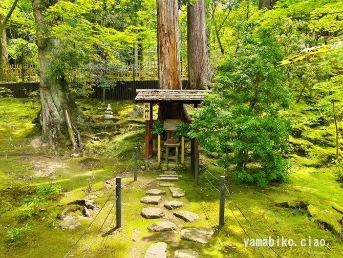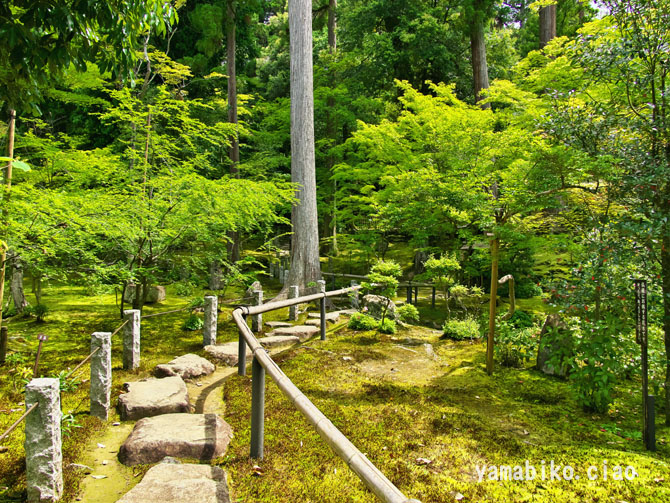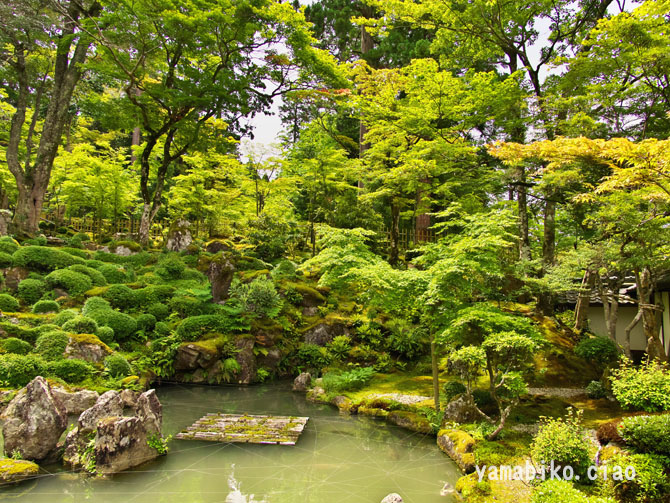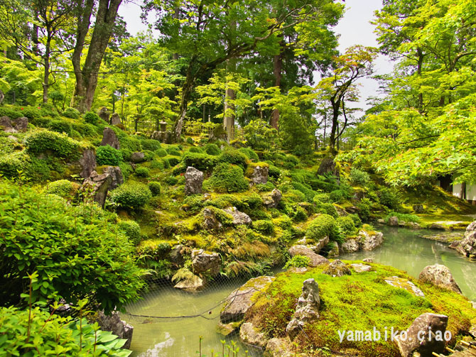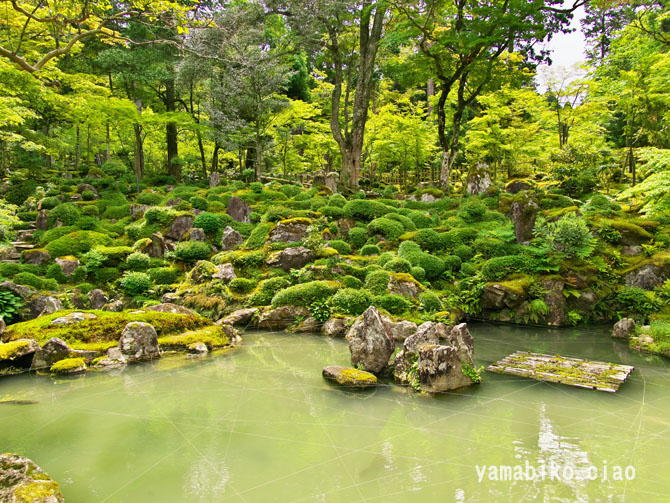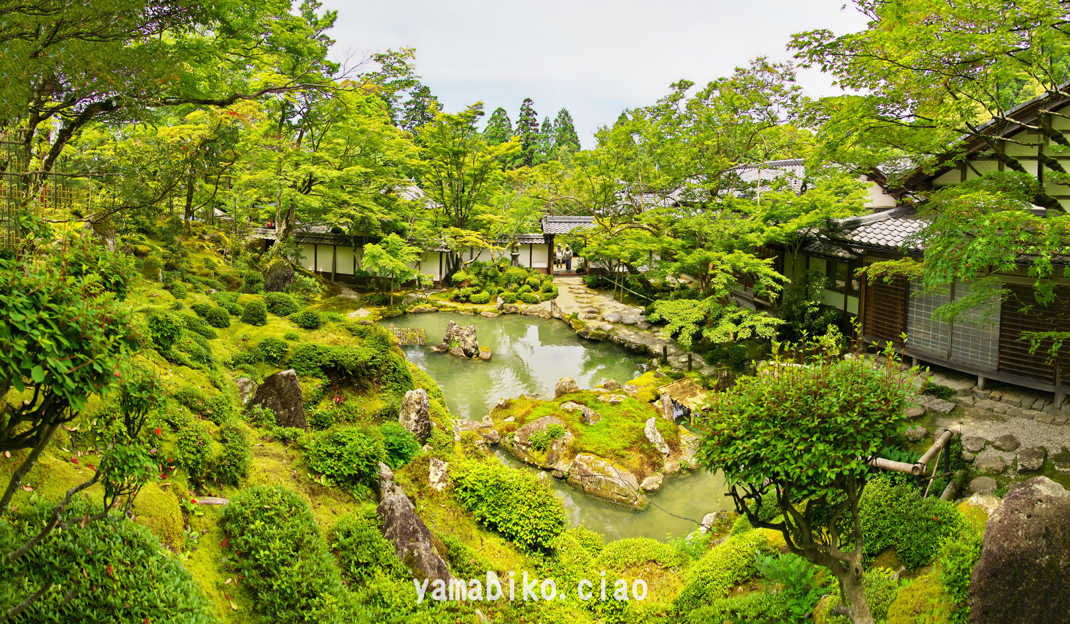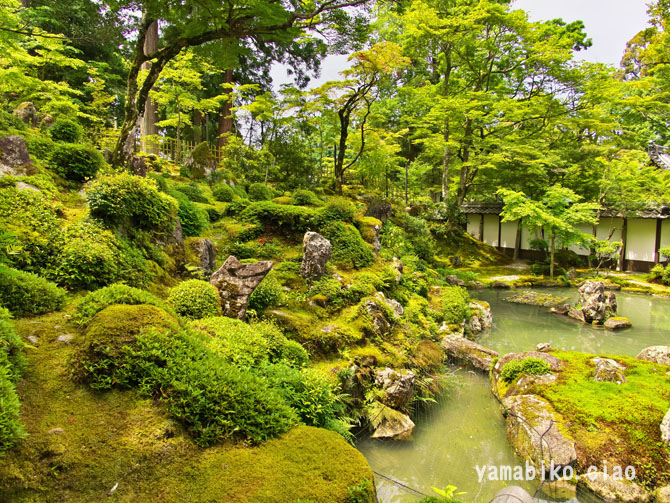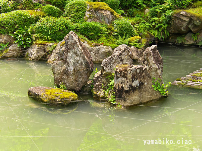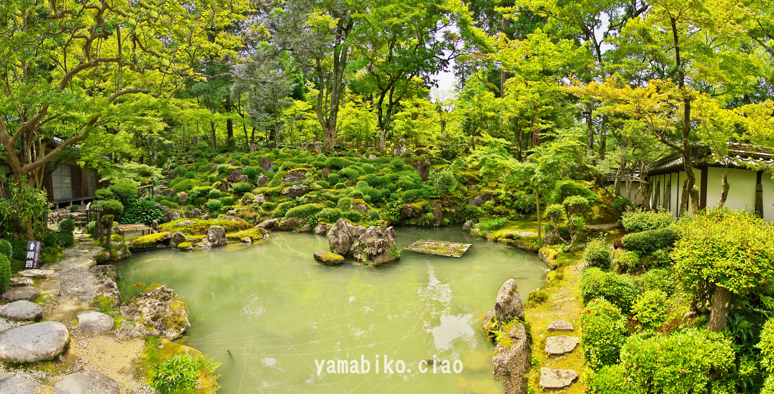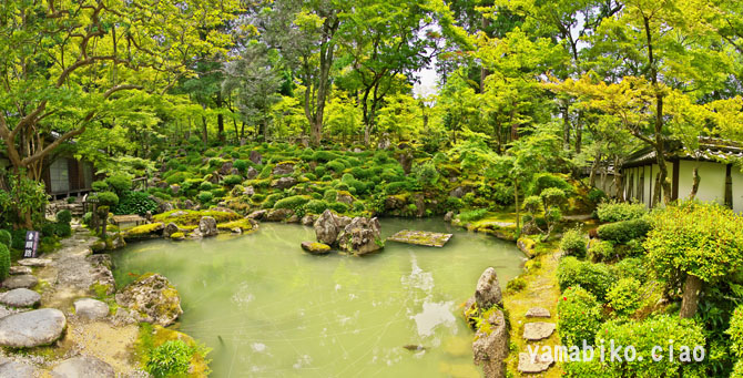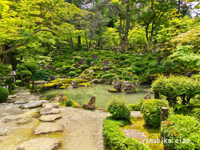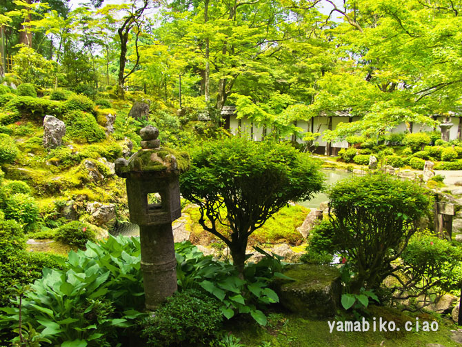 心字池の中央には、折鶴の形をした鶴島と亀島を配す『池泉鑑賞式』の庭園です。鎌倉時代の灯籠で「弥陀六の灯籠」と呼ばれる八角石灯籠や、連珠模様の室町時代を偲ぶ石灯籠があります。庫裡南側の山の斜面を利用して築山とし、築山の立石群は、本堂に安置している本尊薬師如来・日光菩薩・月光菩薩の三尊仏とその眷属(十二神将)を表しています。また、植木の刈り込みは雲を表し、全体で薬師如来の浄瑠璃浄土を表し、仏の世界が具現化されています。