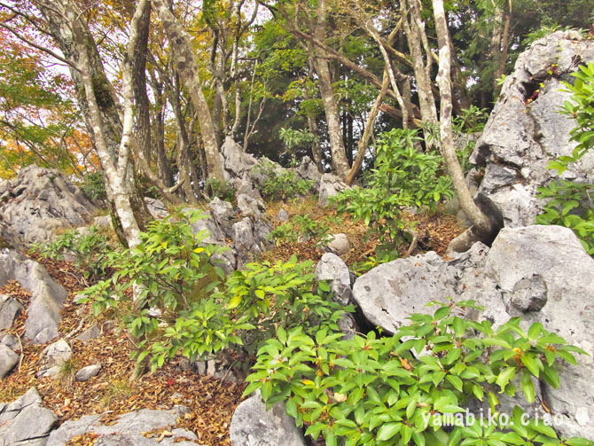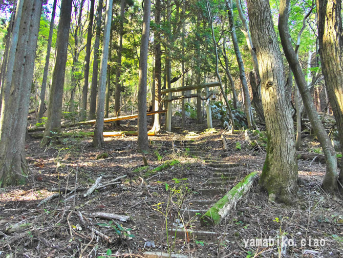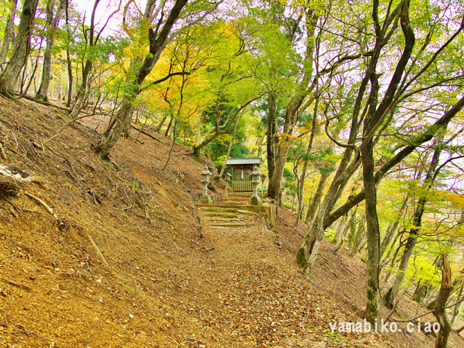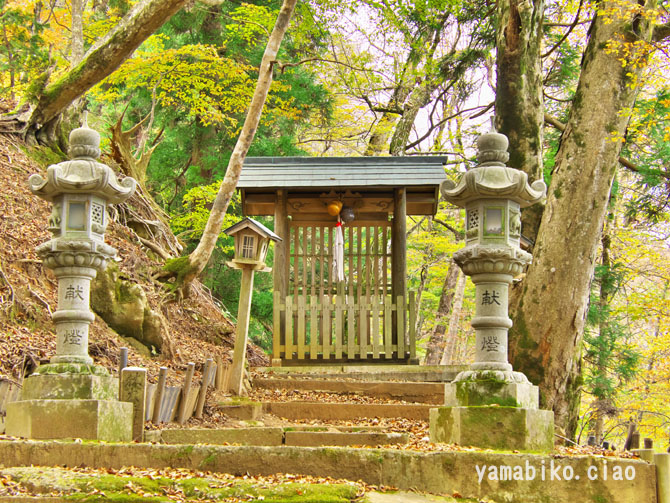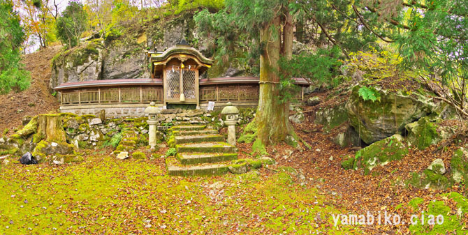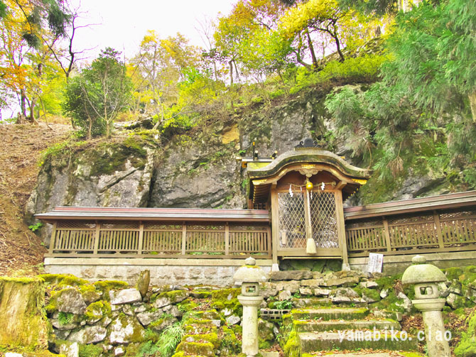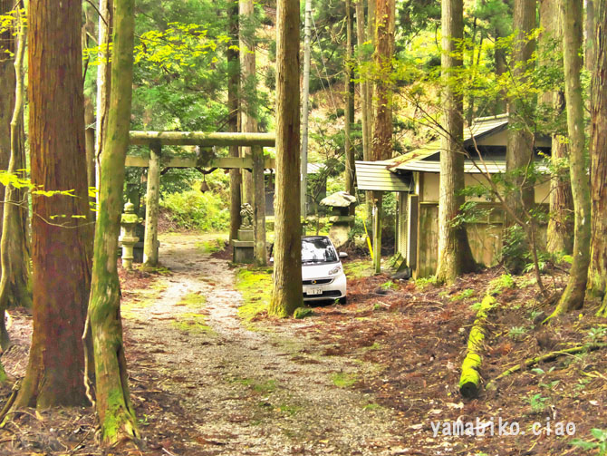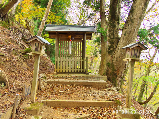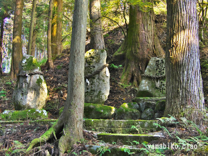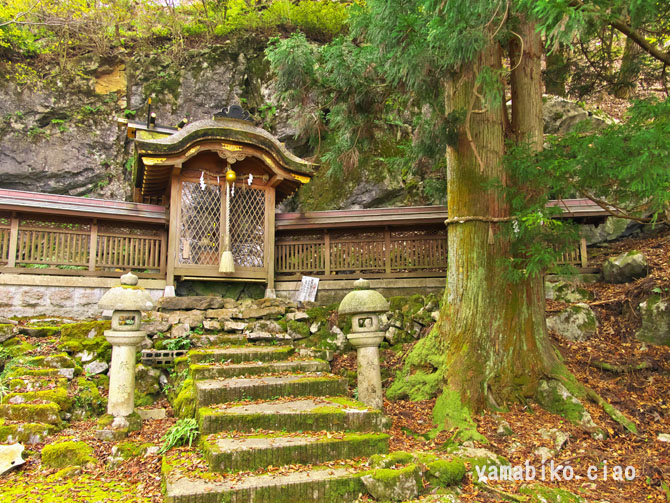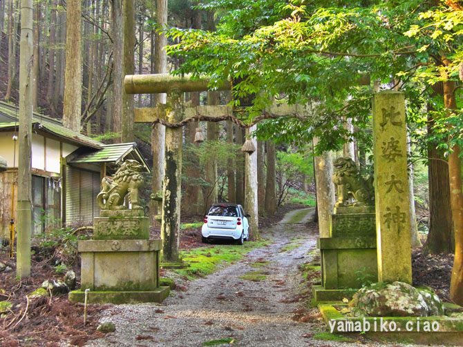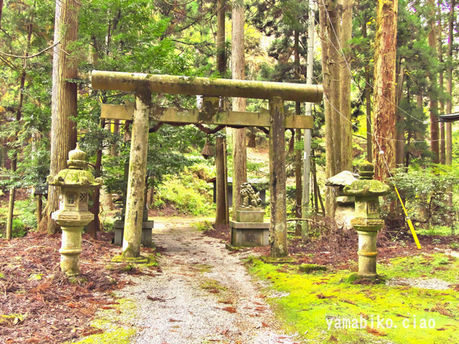 伝えによると、『ここを遥かに仰げば、森厳極りなき護持ヶ谷の聖地なり。この地、古昔より比婆の山と称し、山頂に岩窟あり、比婆大神と称え奉り、伊邪那美大神を祀る。創立年代、これを古書に求めれば往昔にあり。御霊験をあらたかにして、世に「山神さん」とも敬ひ奉り、近郷は申すも更なり、湖東・湖北・関ヶ原さては、全国津々浦々より聖地に聞き伝えて参詣する者月に日に数多・・・・』、とあります。比婆神社社殿は、石灰岩の岩の上に建ち、両翼に瑞垣が巡り、まるで白鳥が舞い上がるようにも見えます。本殿は、岩に包まれるように建ち、磐座のような風情です。あたりは、カレンフェルトで、岩の隙間の穴からは涼しい風が頬をなでます。商売繁盛の神社で、多くの方がお参りに見えているそうです。麓の男鬼町から、舗装道路が延びているのですが、とても狭い上にヘアピンカーブがあり、かなり運転するのに度胸を要します。歩くとなると約40分程。