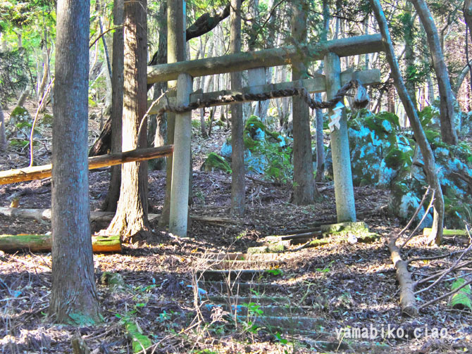 社殿前広場の右岩、大昔に社殿裏の岩が崩れたものでしょうか、中央がさらに崩れています