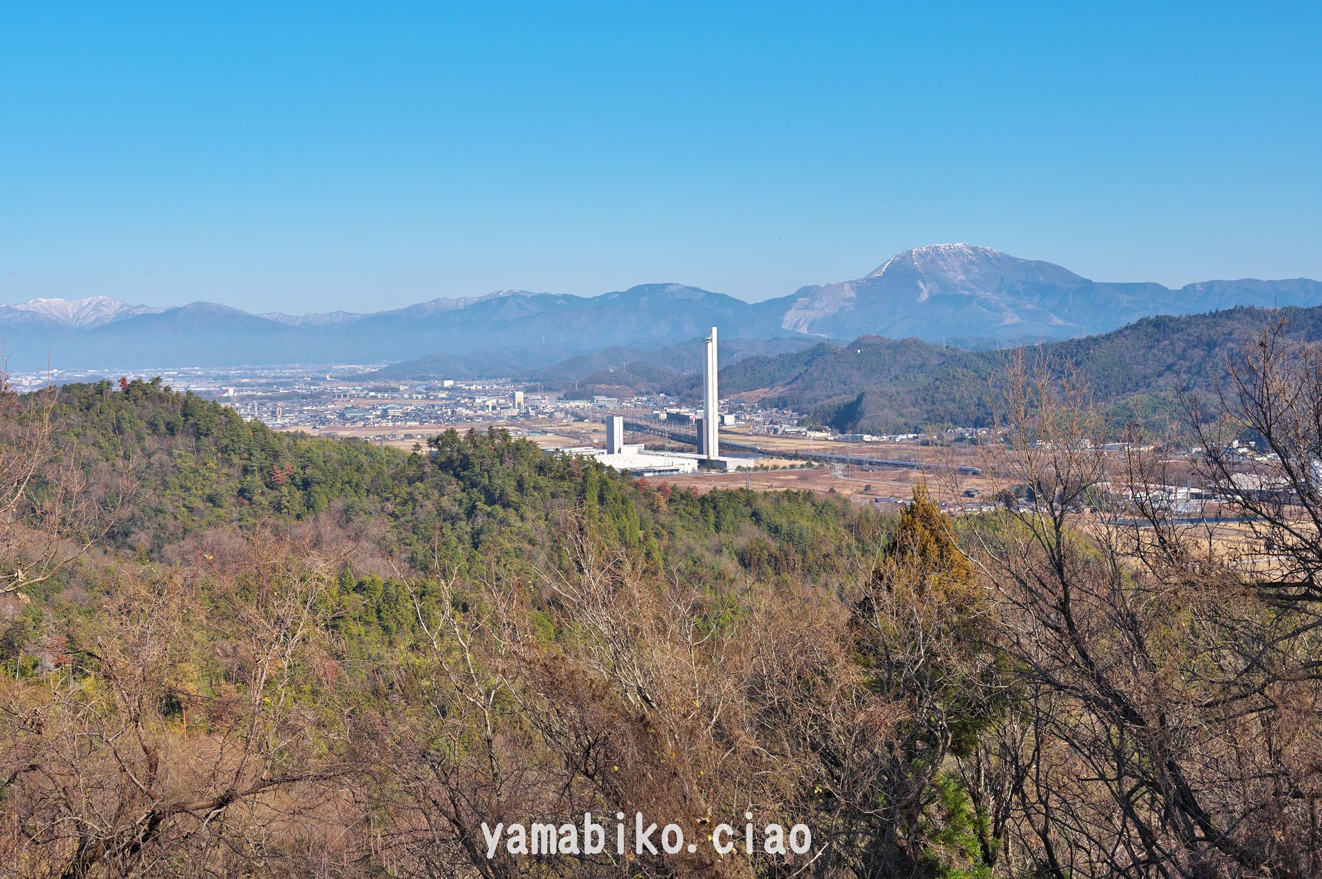 佐和山山頂より伊吹山展望、最左端は金糞岳、右から中央奥に新幹線(2024.01.02、滋賀県彦根市)