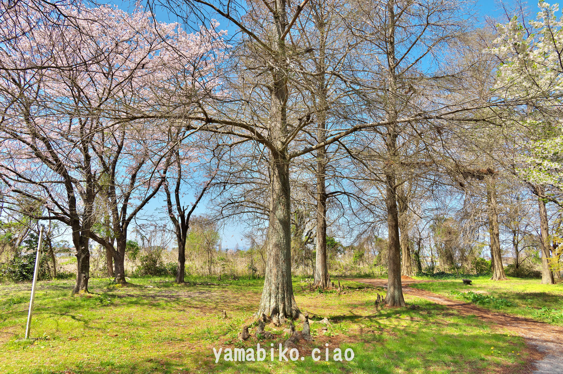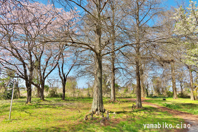 荒神山西側山麓にある曽根沼緑地公園、落羽松の呼吸根が見られます(2024.04.10、滋賀県彦根市)