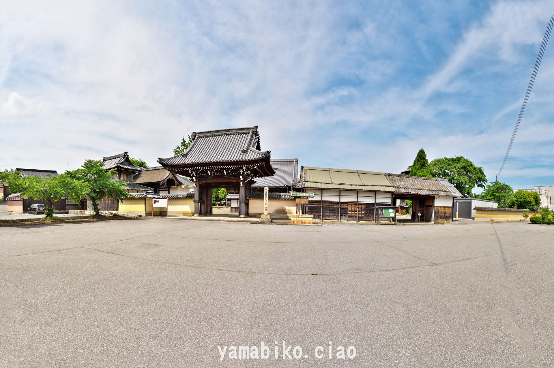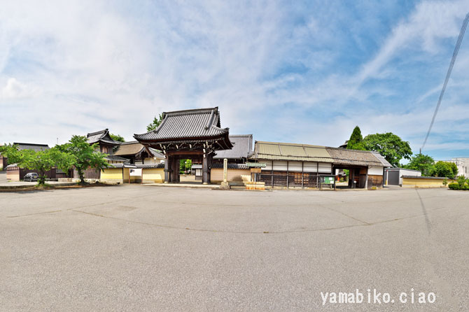 「長沢御坊」とも呼ばれる寺院、目を引く大規模な築地塀、※パノラマ (2024.05.22、滋賀県近江町)