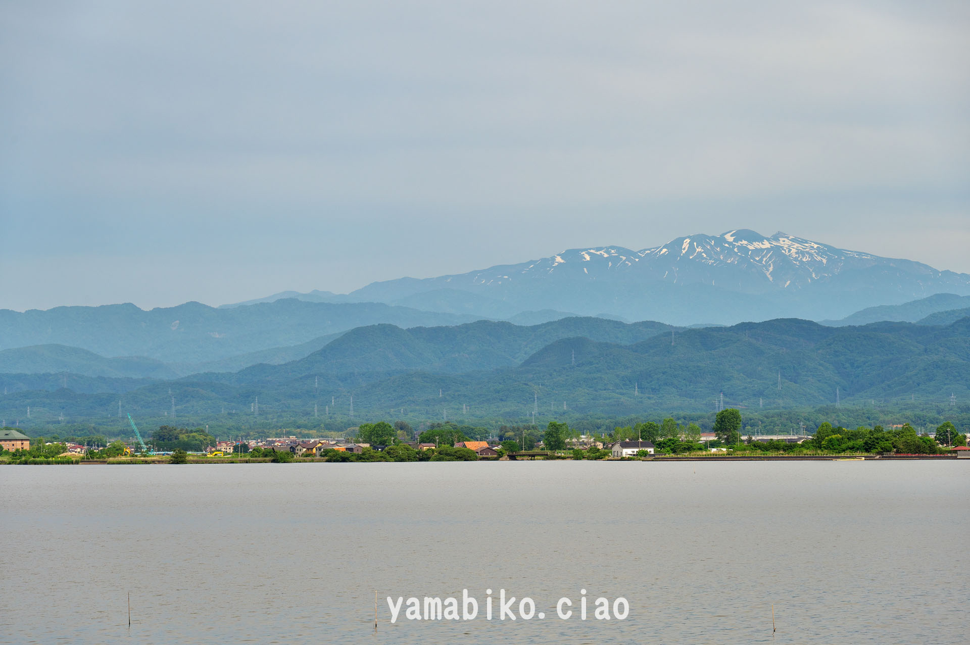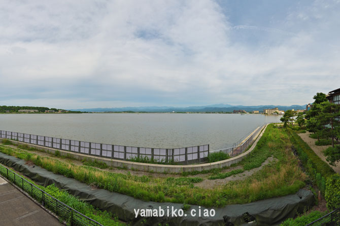 片山津温泉にある柴山潟西側湖畔からのパノラマ、白山が望見 (2024.05.30、石川県加賀市)