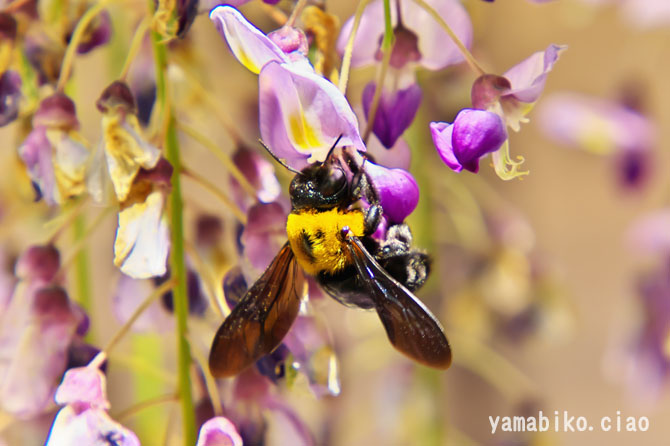 フジの花房に飛び交うクマ蜂、20日間で集める蜜の量はスプン一杯とか(2025.05.08、滋賀県草津市)