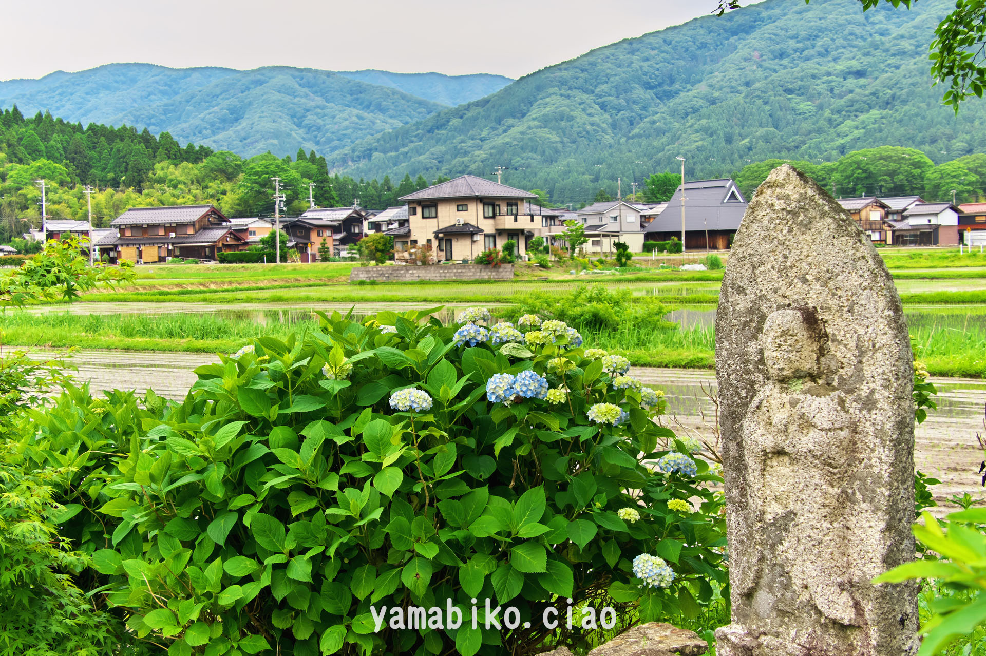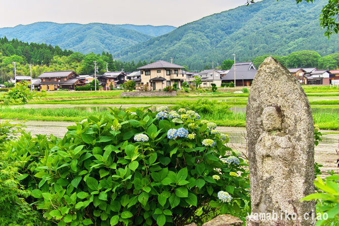 村はずれのお地蔵さんアジサイ花が寄り添います、詩情が漂います(2025.06.12、滋賀県余呉町)