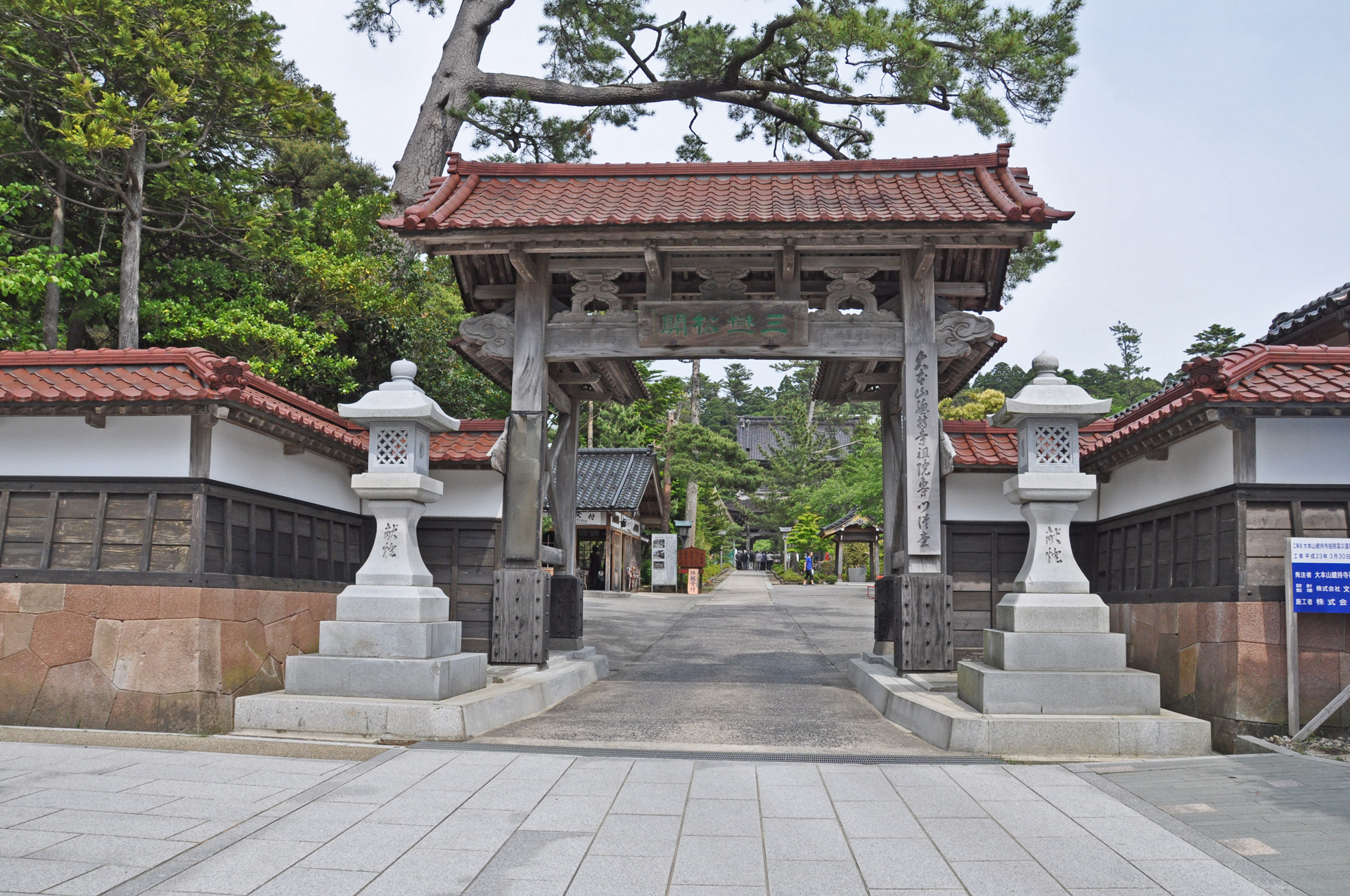 この門は、切妻造り桟瓦葺。扁額「三樹松関」はこの門のそばにあった3本の龍の形をした松に由来するといわれています。