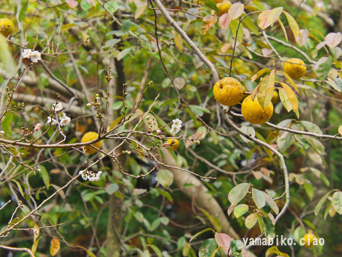 | ばんしゅうにさくらさく | 概要 江戸時代までは「二十八所大明神」と呼ばれていた彌美神社(みみじんじゃ)。境内から西側約750mに社号碑が建っているなど、広い信仰が窺われます。そんな境内で、晩秋に咲く桜を見つけました。十月桜や冬桜などがあげられますが(どちらかは不明)、秋から冬にかけて咲くことが多く、春にも再度咲く二度咲きの特徴を持っています。花はやや小ぶりで可憐な印象を与え、紅葉と桜の両方を楽しめる風景が魅力です。カリンとのコラボがその証拠。 | ||