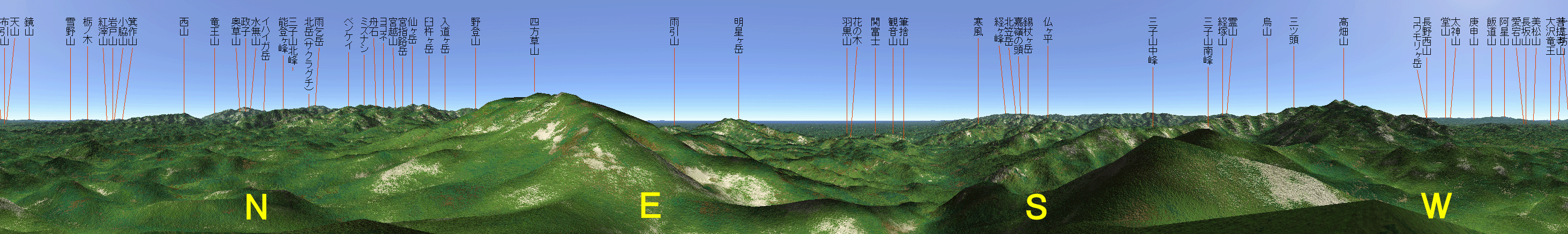 カシミール3D | 羽黒山山頂 から 四方草山 錫杖ヶ岳 |