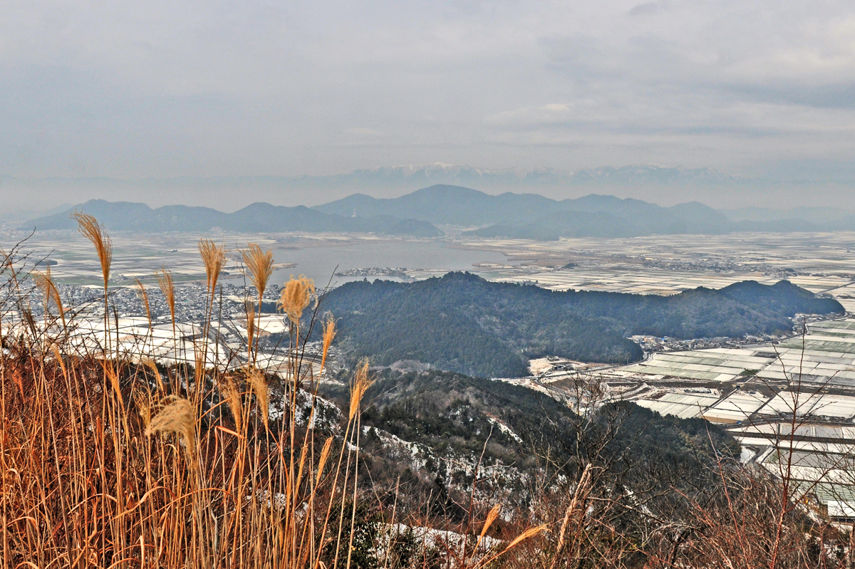 滋賀湖東北部にある繖山北尾根からの西側パノラマです。奥島丘陵や八幡丘陵、彼方には比良山系が望めます。霞でせっかくの眺望が台無し。