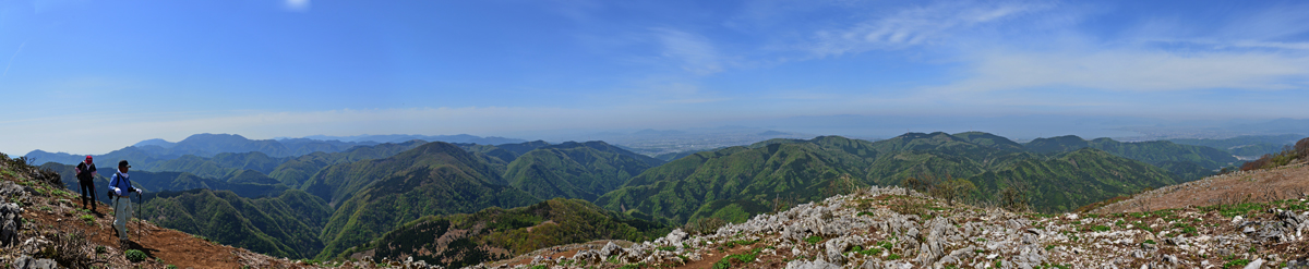 滋賀北鈴鹿北部にある霊仙山西南稜からの南東側展望です。鈴鹿の峰々が望見できます。この時期は木々の若芽が山々を萌木色に浮かびあげます。いい季節です。 2014.05.04(滋賀県多賀町)