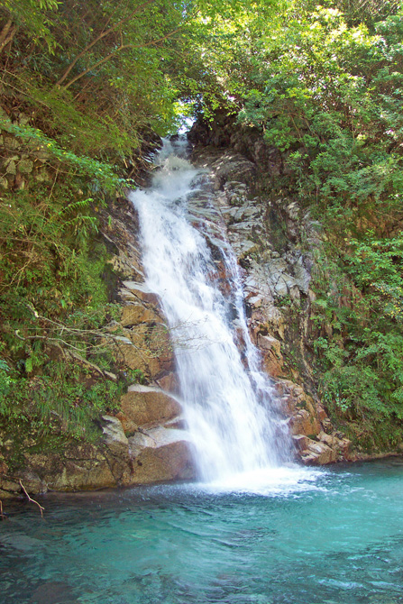 | 概 要 | 竜ヶ岳の山麓を流れる宇賀渓は、鈴鹿を代表する渓谷美を誇ります。大小さまざまな滝が、その美を競い合うように水飛沫を立てています。渇水期では、沢歩きが楽しめ、岩の上を飛んでいく心も、軽やかになります。しかし、一旦増水すると、進入を妨げる龍に変身し、飛び石伝いが困難になります。 マイナスイオンが、辺り一面に漂っています。 台風直後に訪れたため、山中の静寂を打ち破 り、岩間を縫いながら、滝壷めがけて長い尾をたなびかせています。辺りには涼しい風が吹き渡り、汗ばんだ躰に心地よく感じます そこで一言、『 風涼し 岩間縫い落つ 碧き水 』 |