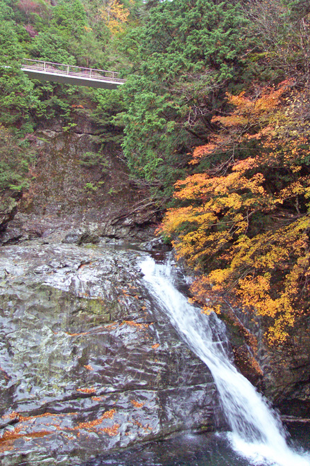 | 概 要 | 天川村は、山岳信仰で知られる大峯山の麓に開ける村です。大峰山系を、源とする山上川沿いには、遊歩道が設けられ、渓谷美が堪能できます。中でも、みたらい渓谷は、近畿を代表する渓谷として、内外に知られていて、大小の滝や淵、大きな岩壁など、渓谷が醸し出す景観は、おとづれる人を堪能させるにあまりあります。紅葉の見頃は、10月中旬から下旬。錦秋の彩の中、青龍との調和に浸れる時空です。 大峰山系から流れ来る水が渓谷を作り出し、 岩と水が織り成す自然の造形美が、訪れる人を引きつけて止みません。天空に懸かる(かかる・心情などを表す)吊橋が、まるで龍のように滝壷から舞い上がり、橋をまいて(舞いながら・包みながら)昇っていくようです。 そこで一言、『 秋雨に 懸け橋まいて 龍昇る 』 |