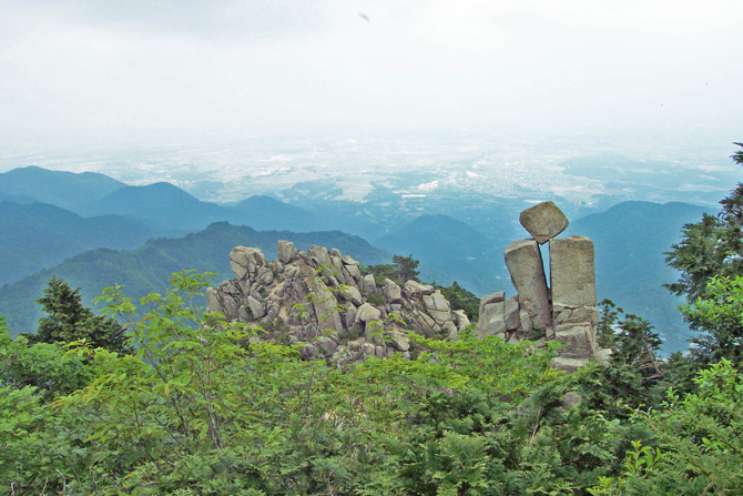 | 概 要 | 御在所岳は奇岩巨石があることでも知られています。紹介の岩は、「地蔵岩」と名付けられています。2本の石の柱の上にバランスよく四角い石が乗っていますが、どうして落ちないのでしょう。答えは、リンク先を開くと解けると思います。それにしても、自然は考えもつかないものを造り出します。 春から夏への移り変わり時、御在所岳の中道を歩き、道中で奇岩の一つ、「地蔵岩」を見かけました。石柱の上に、思案首の様な造形に、威厳があり、物事に動じないであろう閻魔様(閻魔大王は地蔵菩薩が化身されたもの・地蔵菩薩と同一視)も、思案首をなされ、その不思議石の造形にさぞ驚かれたことでしょう。 そこで一言、『 夏近し 閻魔も思案 不思議石 』 |
