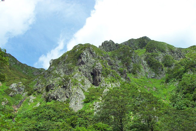 | 概 要 | 三周ヶ岳は福井県今庄からと岐阜県坂内村からのコースがあり、県境の尾根下に夜叉ヶ池があることで知られています。岐阜県側のコースは、V字谷を尾根までの行程の半分を、大きな高低差もなく進み、残りを急勾配で尾根まで進みます。尾根近くにある「昇竜の滝」がコースに変化を与えてくれます。三周ヶ岳は、岩稜の右奥を進みます。 夏の雲は、夏空に大きく湧き上がる積雲や積乱雲の総称で、夏の代表適な風物詩です。夏に、山のように高く聳え立つ入道雲は、目の前にある夜叉壁のようでもあります。雲の峰のような岩稜を伝い、龍が天に向かって登っていくさまが想像できます。 そこで一言、『 雲の峰 夜叉壁伝い 龍昇る 』 |