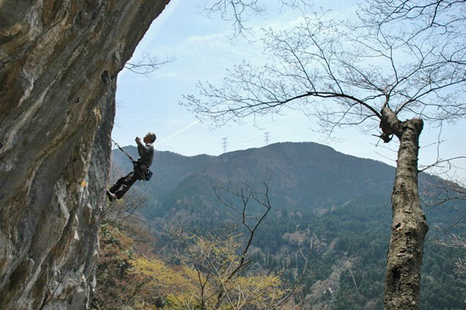 | 概 要 | 屏風岩は芹川(芹谷)の中央付近右岸にあり、幅約200m、標高差約50mにわたって形成され、大きく2箇所の岩壁からなっています。芹谷からもその一部が望遠でき、登攀を楽しむ人たちを見かけます。この地域の地質は石灰岩が多く含まれています。石灰岩特有の前傾壁を有することから、このような景観が生まれました。 前面に聳える山はアミダ峰で、偶然にも木の枝と稜線がだぶり、クライマーの安全を見守っているようです。新緑が萌え出し、絶好の登攀日和です。 そこで一言、『 絶壁の 登攀見守る 萌える峰 』 |