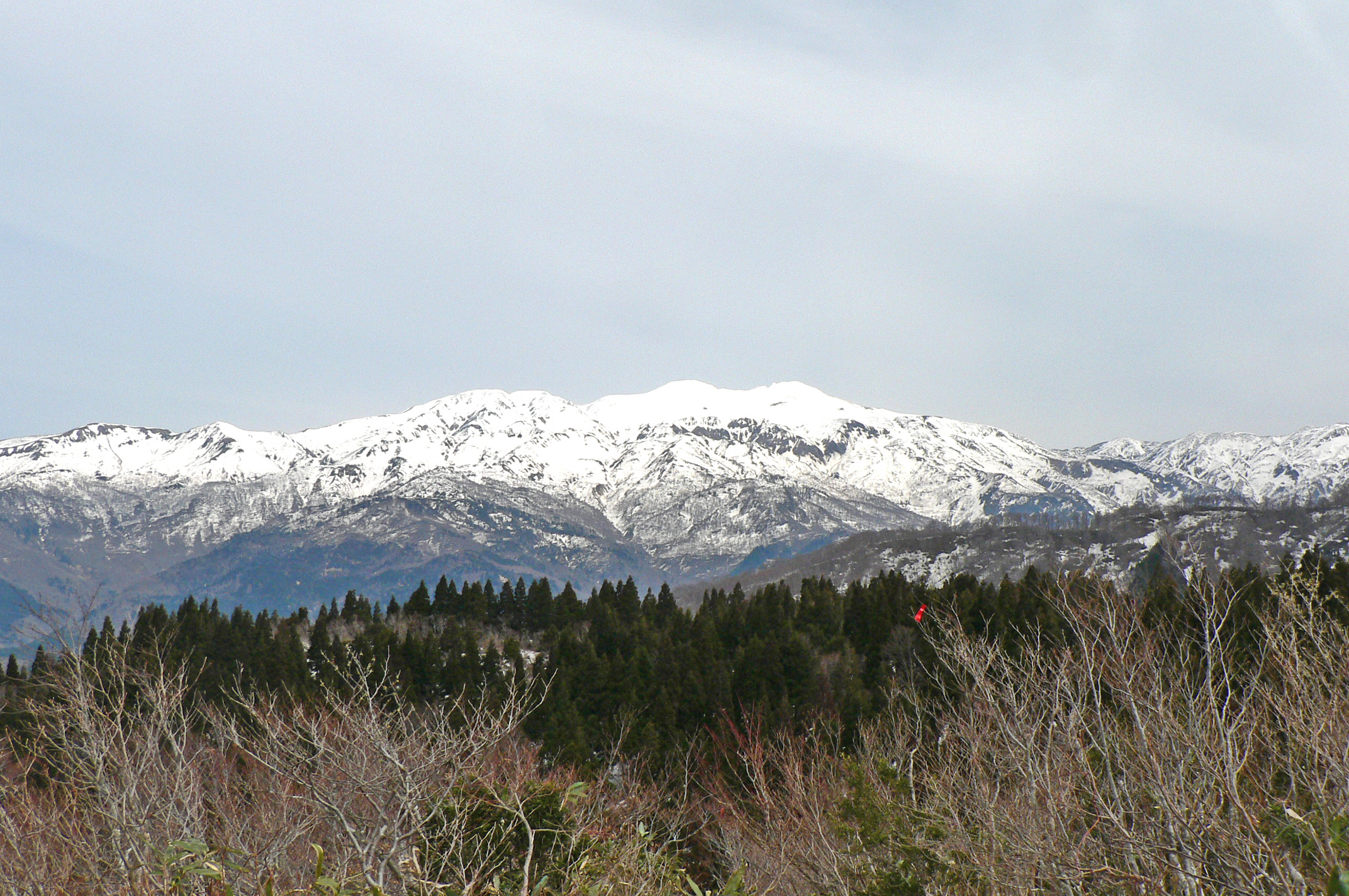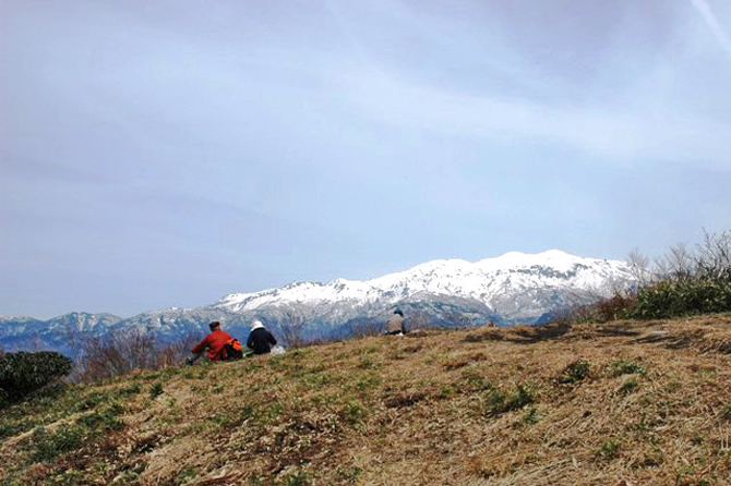 | 概 要 | 勝山市と石川県白山市の境に位置する取立山は、水芭蕉の群生地として知られています。花の見頃は5月中旬ごろといわれています。また山頂では白山の大展望が眼前にひろがり、春は雪を頂く峰々を前にして高揚感が身を包んでくれます。ここは取立山山頂から北に約0.5km、コツブリ山です。眼前に白山が雄大な姿を横たえています。 春を迎え、気温が上がり始めた雪山は、雪が解け始め雪形も現れ始めます。昼食をとりながら、めったに姿を見せてくれない白山の山容は、雲が刷毛で奇麗に刷かれた後のように、山容が白く輝いています。白き峰の景観を、たらふく記憶の中にとどめました。 そこで一言、『 雲を刷き 姿見えたる 雪の型 』 |