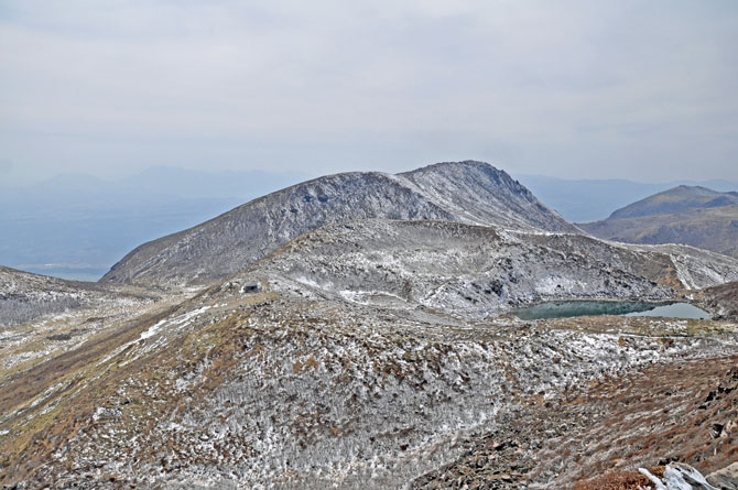 。日本百名山の一つに数えられ、一帯は阿蘇くじゅう国立公園に指定されています。5月下旬頃にはミヤマキリシマが山頂をピンクに染め、秋にはジュウタンを敷き詰めたかのように紅葉が覆います。登山道は、山々を縫うように縦横に通っています。どの山頂に上っても360度の展望がひろがります。中でも九州最高峰の中岳からは、文字通りのさえきるものは何も無しの展望が展開します。時期はずれの雪が頂を白く染めます。 そこで一言、『 九重(ここのえ)の 波打つ峰を 染めし雪 』 |