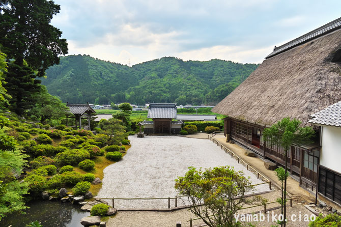 その後、安土桃山時代の慶長7年(1602)に、寺号を萬徳寺と改められ、江戸時代の延宝5年(1677)に、小浜藩主酒井氏の命により、音無川の岸から現在の山麓に寺地を移されました。 茅葺屋根のある御堂前には、天然記念物の「大山モミジ」を借景とする枯山水庭園で知られています。初夏にはツツジ、秋には紅葉が白砂と調和しています。御堂では、日課の勤行が行われています。その声に乗せ、初夏の爽やかな風が吹き抜けてゆきます。 そこで一言、『 初夏の風 茅葺屋根の 御堂にも 』 |