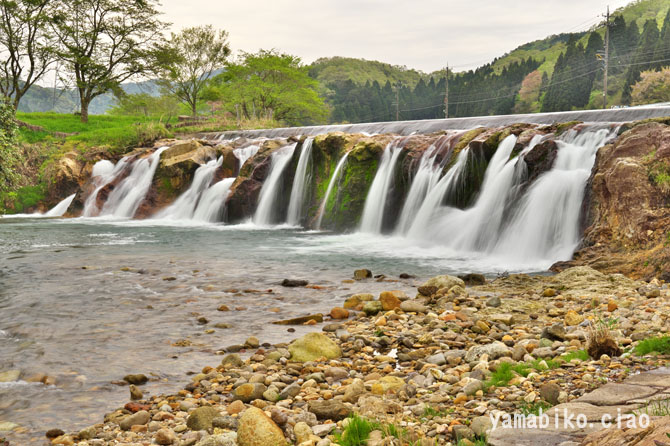 | 概 要 | 十二ヶ滝は、その名の通り、郷谷川の流れがここで12の筋に分かれて落下している様が由来です。音を立てて豪快に流れ落ちる光景は、見ごたえ抜群。特に4月から6月にかけては雪解けで増水するので、さらに迫力満点です。郷谷川沿いに国道416号が走り、滝壺下流左岸に駐車場も整備されているので、あまり歩かずに探勝が可能です。落差は5m程、幅が36mもあり、ミニナイアガラの様相を呈しています。昔は落差が6mくらいあったらしいのですが浸食されたようです。 周囲は、きれいに整備されていて、駐車場のすぐ横にある階段を降りて、滝のそばへと行けます。昔から滝は信仰の対象でもあり、滝の上手には、八幡大菩薩、観音菩薩、不動明王を祀る祠があり、十二ヶ滝神社と呼ばれてたそうですが、後年移築されたそうです。 新緑の青葉を吹き抜ける爽やかで力強い風(風青し)が心地よく、田畑を縫う川に、川幅一面に滝が流れ落ちています。その様は、まるで水簾(みずすだれ)の様な姿です。 そこで一言、『 風青し 小川に懸かる 水簾 』 |