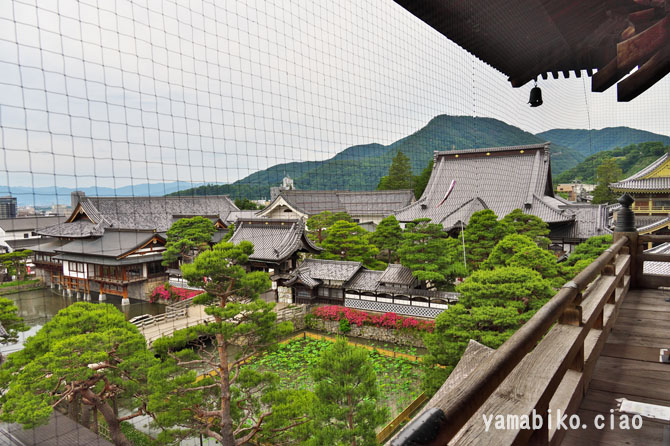 | 概 要 | 善光寺は、宗派:無宗派(天台宗・浄土宗)、山号:定額山、本尊:一光三尊阿弥陀如来(絶対秘仏)、創建年:(伝)皇極天皇3年(644)、開基:(伝)皇極天皇(勅願)、別称:信州善光寺・信濃善光寺。善光寺は、天台宗の「大勧進」と25院、浄土宗の「大本願」と14坊によって護持・運営されています。現在、39の宿坊があり、それぞれに御堂があり住職がいます。宿坊に泊まったり、精進料理を食べることもできます。 山門(三門)の二階に登ると、四周に高覧があり四方が眺められます。南西側には大勧進がります。大勧進は、善光寺の本坊であり、大屋根の他、支院の堂宇の甍が軒を連ねています。その甍の波と背後にある峰々の波が重なり合い、寺院の規模の大きさが伺えます。その甍の波に乗って、初夏の風が渡ってきます。 そこで一言、『 初夏の風 甍の波と 尾根の波 』 |