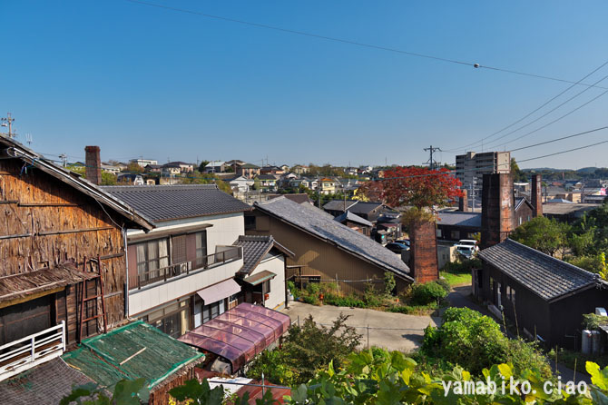 | 概 要 | 常滑やきもの散歩道は、昭和初期ごろに常滑焼を支えてきた陶器製造地区(窯業集落)として最も栄えた一帯で、往時の風情を残す町並みをそぞろ歩く散歩道です。様々な景観資源が至る所に見られ、煙突や擁壁など、独特な景観が形成されています。 近年では、年間30万人を超える観光客が訪れる常滑市の観光地になっています。今も点在する煙突・窯・工場など、時代と共に使われなくなった歴史的産業遺産を巡る町並です。 常滑市内は、起伏がある散歩道が整備されています。風情を楽しみながらそぞろ歩いていると、高台に来ると視界が開け、市街地が一望できるところがあります。彼方此方に煙突が起立し、焼き物の里の面目躍如です。今日は秋日和、長閑です。 そこで一言、『 彼方此方(あちこち)に 煙突起立 秋日和 』 |