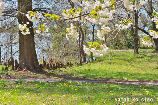 | 概 要 | 曽根沼は、荒神山の西麓に広がる琵琶湖の内湖のひとつで、外周が約2.5km、広さが約20haあります。滋賀県の「ヨシ群落保全地域」に指定され、様々な水辺の動植物が見られます。沼の東側は湖岸緑地公園として整備され、遊歩道や芝生広場、遊具なども設置されています。遊歩道を歩いていくと、岸辺に沼の泥の中から茶色い鍾乳石のようなものが突き出ているのです。これは、ラクウショウの木の呼吸根で、根を水面から出すことで、酸素不足を補っているのだそうです。初めて見る呼吸根に驚きを隠せません。 春の柔らかい光に照らされ、サクラの花が咲き誇ります、沼湖畔には呼吸根が顔をだし、その息づかいがかすかに聞こえてくるようです。静かで長閑な湖畔のもと、風が光を反射してキラキラと輝くように感じられ、桜の木の下で、のんびり〜。 そこで一言、『 沼湖畔 根の息づかい 風光る 』 |