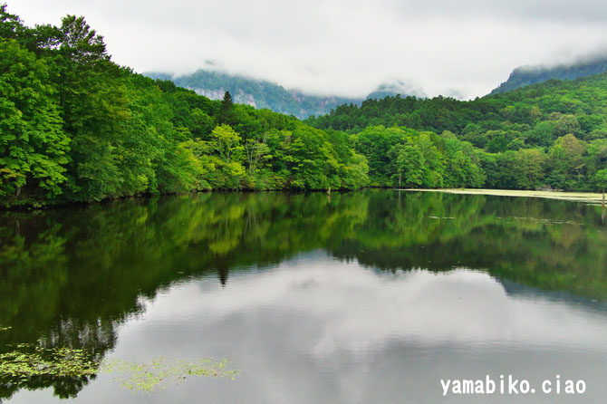 | 概 要 | 戸隠の鏡池は、標高:1200mにあります。太古の昔は海底だった地が、隆起してできた戸隠連峰の裾野に、まるでオアシスのように清水を湛える池です。実は、農業用のため池です。標高が高く寒冷な戸隠では、水田耕作を行うために、水を温めてから田に引く必要がありました。戦後、それまで悲願だった稲作を実現したのが、ため池を利用した用水の確保だったのです。 晴れていれば、水面に映る戸隠連峰はもちろん、日の当たり具合によって異なる緑のグラデーションの変化など、ゆっくりと楽しめます。訪問時は、雨模様のため戸隠連峰は雨に煙り、風はそよ風程度だったので水面の波立ちもさほどなく、山の写り映えもほどほどでした。木々の葉も、紅葉が山から降りてきました。もう少しで、秋の色が万色に包まれることでしょう。 そこで一言、『 山煙る 神秘の池に 秋の色 』 |