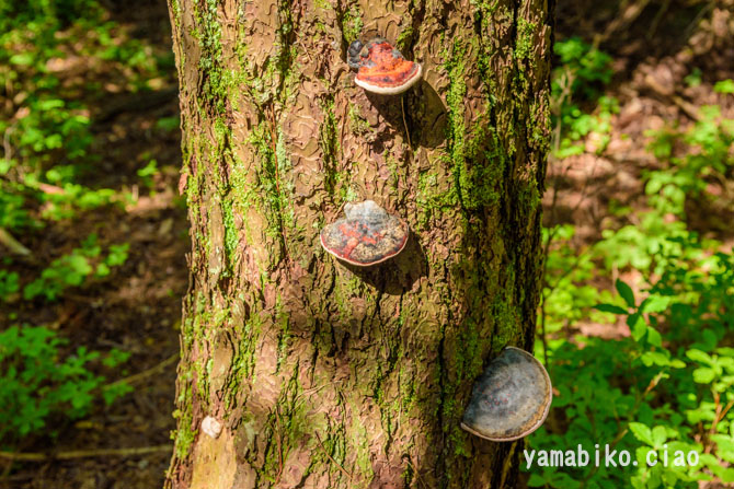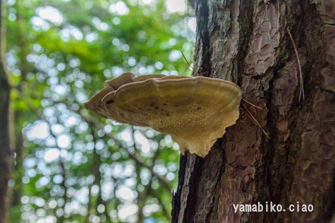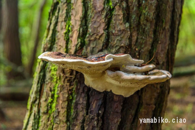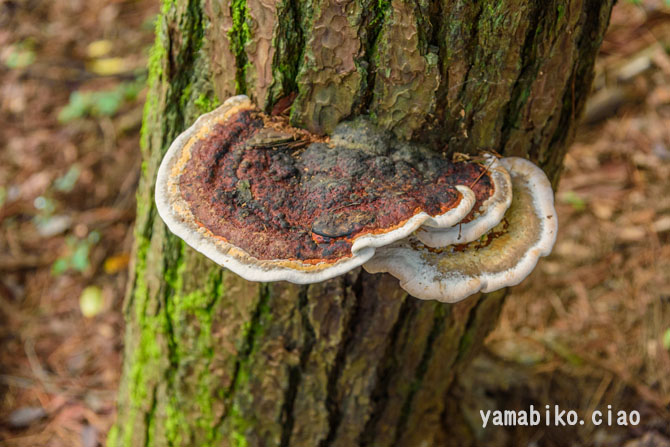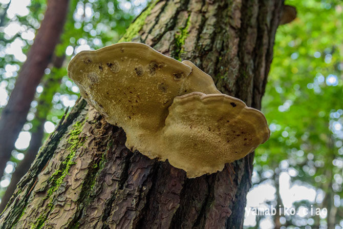 | さるのこしかけ | 一般に、樹木の幹に無柄で半月状の子実体を生じるものが多く、背着生のものや、柄とかさとを備えるものもあります。子実体は、一般に堅くて丈夫(木質・コルク質・革質など)です。胞子を形成する子実層托は、典型的には管孔状をなしていますが、迷路状・ひだ状・鋸歯状などをなすこともあります。科名を持つ種は存在しないため、暫定的な処置です。大部分は、木材を分解して栄養源とする白色腐朽菌や褐色腐朽菌です。一部に、漢方薬や民間薬として用いられます。 | |