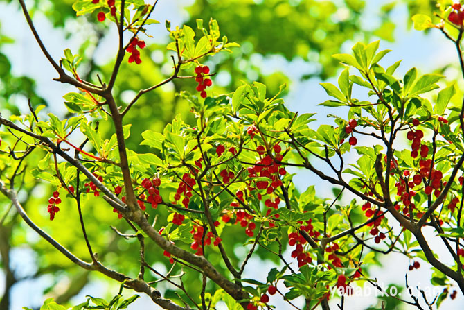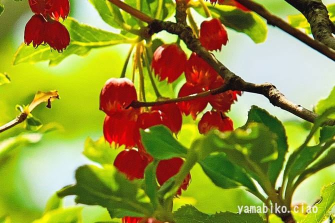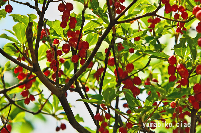 本州の関東地方以西から九州に分布し、山地の岩尾根などに生育する落葉低木。葉は、枝先に車輪状につき、枝から互い違いに生じます。長さは2〜4cmで、ドウダンツツジと比べるとやや大きい。紅葉する木としては、葉の小さな部類に属し、紅葉は見応えがあります。開花期は、新葉が開いた後の初夏に、真っ赤に近い花が5〜10個単位で、まとまって枝先に垂れ下がります。花は、大きな釣鐘型で花、冠は長さ5〜8mm。大きく五つに裂け、さらに細かく裂けます。 |