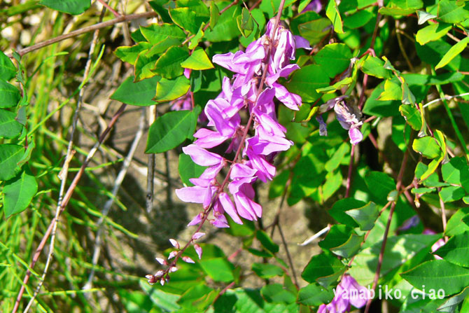 葉は小葉4〜7対+1枚からなる奇数羽状複葉で、互生します。鮮やかな緑色で、特に新緑はとても綺麗です。小葉は、先が尖った長楕円形〜狭卵形。初夏の頃、上部の葉腋に総状花序を作り、淡紅紫色の蝶形花を咲かせます。花色が白や薄桃色のものもあります。果実は円柱形の豆果。