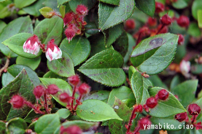 北海道・本州(主に近畿地方以北の日本海側)・四国に分布し、日当たりのよい高山や深山に群落を形成して生育する常緑低木。シラタマノキという白い実をつける植物に対比して、つけられた名前です。樹高は10〜30cmほど。若枝には長い赤褐色の毛が生え、花の大きさ6〜8mmで釣鐘形の白から淡い桃色の花が下向きに咲きます。和名の由来は、果実が赤く熟し、甘みがあり美味しいところから、アカモモ(赤桃)が訛ったもの。岩地などに生えることから、別名イワハゼ。 |