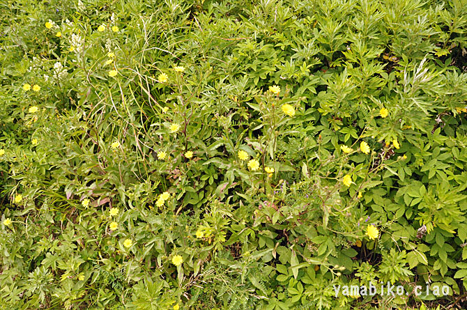 | こうぞりな | 日本の各地の適湿でやや栄養分の良好な場所をに分布し、路傍・原野・牧草地などに生育する越年性の一年草。秋に芽生え、ロゼットで越冬します。夏草が茂る頃になると、花茎を延ばして高さ1m近くに生長します。花は、茎上部で枝分かれして多数つき、直径20〜25mm。頭花は、舌状花だけからなります。全体に剛毛があり、さわると著しくざらつきます。このような手触りを、カミソリにたとえ、剃刀菜と呼んでいたものがコウゾリナになまったといわれます。顔剃菜とも。 | |