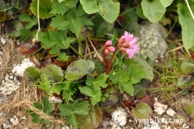 日本の固有種。本州の中部地方から奈良県に分布し、高山帯の岩場や草地に生育する常緑の多年草。草丈は5〜10cmくらい。葉には長い柄があり、根際から数枚が生えます。葉は、直径2cmくらいの卵円形で、先は丸いかややへこみます。葉の質は、革質で表面には艶があります。花茎の高さは5〜10cmで、先端に1〜5個の花を偏在的につけ、雪解けを待っていたようにすぐに咲き始めます。名の由来は、岩地に生え、葉に光沢がある事から鏡に見たてたことから。 |