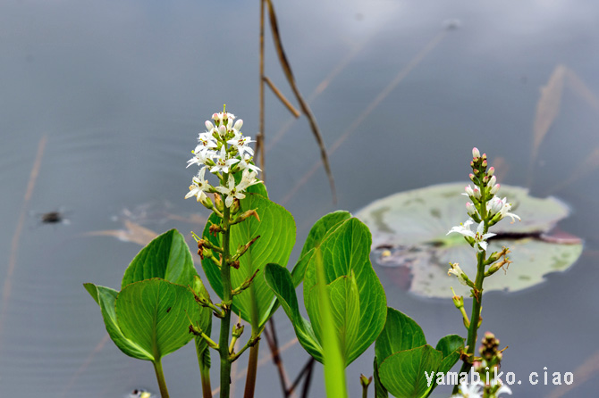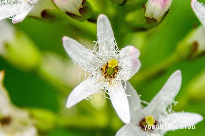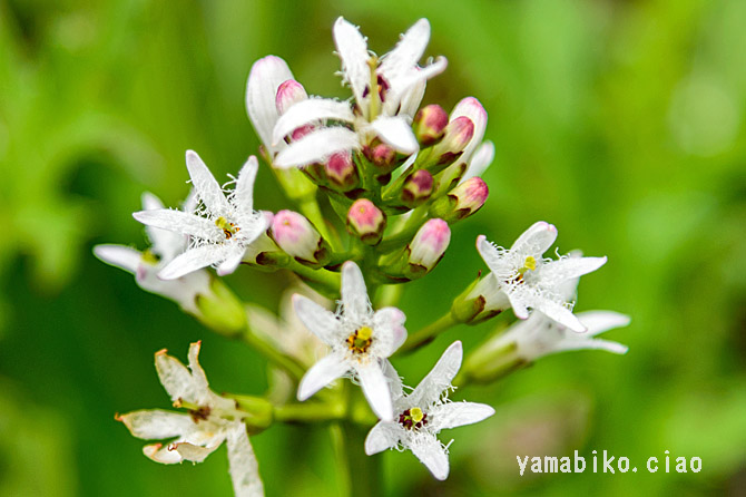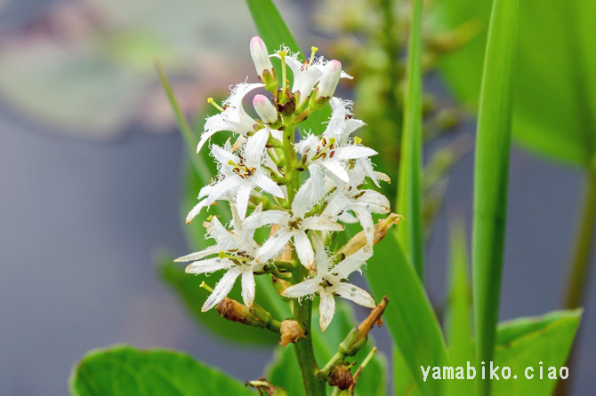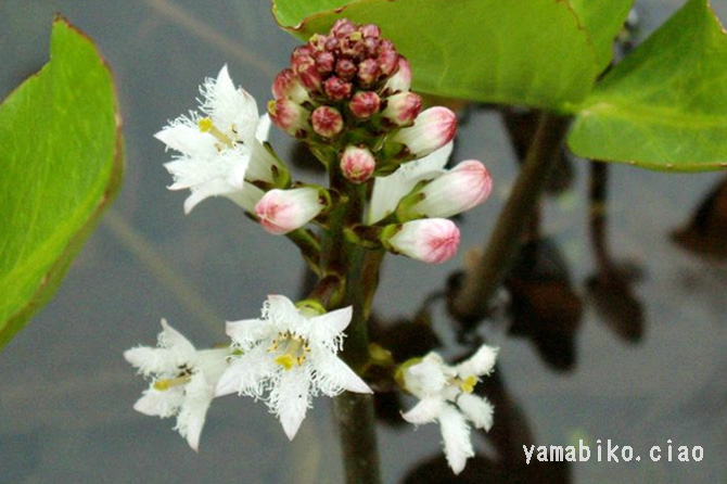 北海道から九州に分布し、山地や低地の沼地や湿地に生育する多年草。地下茎を横に伸ばして広がり、草丈は15〜40cmほど。葉は複葉で、3小葉からなります。白い花を総状花序に多数つけます。亜寒帯や高山に多いですが、暖帯の一部にも孤立的に自生しているものもあります。これらは、氷河期の生き残り(残存植物)と考えられ、これらを含む水生植物群落は、天然記念物に指定されています。睡菜(スイサイ)と称し、苦味健胃薬として用いられます。