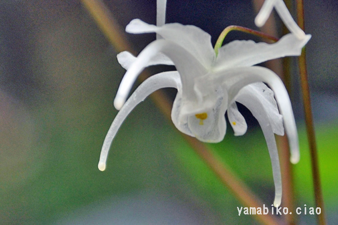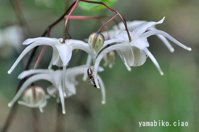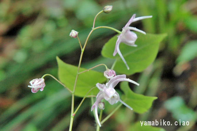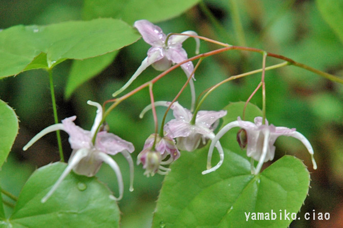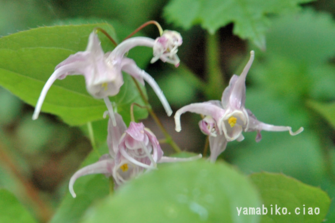 北海道から九州ぼ太平洋側に分布し、山地の林下に生育する多年草。イカリソウの一品種。花は下向きに開き、径3cmほどで、白ないし紅紫色。花の四方に伸びた角のような部分で、いかりの鉤にあたる部分は「距(きょ)」と呼ばれる器官で、これは花弁の一部が袋のように変化したものです。和眼の由来は、姿が船の錨のような特異な形をしていることから。園芸用や薬用に栽培されることもあります。