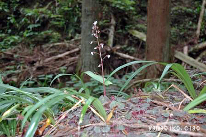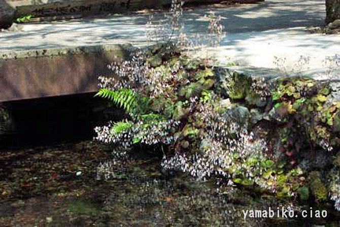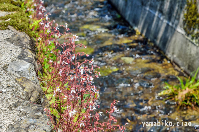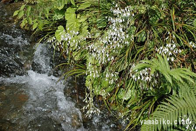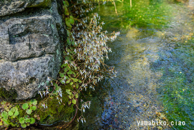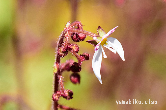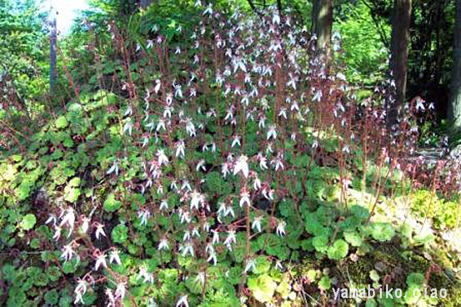 本州から九州に分布し、湿った半日陰地の岩場などに生育する常緑の多年草。葉は円形に近く(腎円形)、葉裏は赤みを帯び、根本から匍匐枝を出して繁殖します。高さ20〜50cmの花茎を出し、多数の花をつけます。花は5弁で、上の3枚が小さく濃紅色の斑点があり、基部に濃黄色の斑点があり、下の2枚は白色で細長いです。和名の由来は、雪が上につもっても、その下に緑の葉があることから。他説に、白い花を雪(雪虫)に見立て、その下に緑の葉があることから。