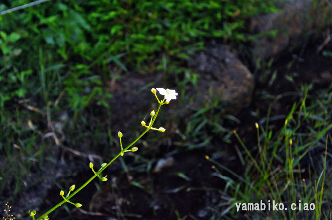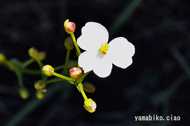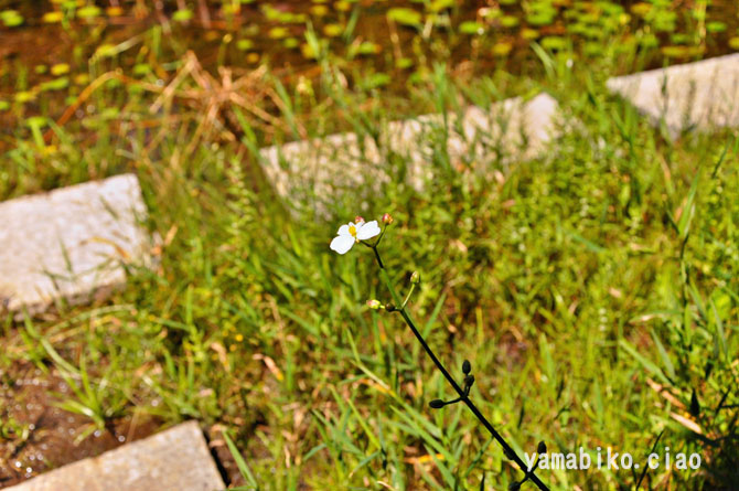 日本全土に分布し、水田や湿地、溜池などに自生する多年草の水生植物。春に、種子と塊茎から発芽します。発生初期は、線形の葉をつけますが、生長が進むと矢尻形をした葉をつけます。葉の長さは、最大60cmほどで、形態は種内変異に富みます。花は単性花で、雌雄同株、白い花弁を3枚つけます。ハナグワイ、サンカクグサ、イモグサ、オトゲナシなど多くの別名があります。日本では昔から愛されている花で、蒔絵の紋様にも描かれ、武具や衣服にも登場します。