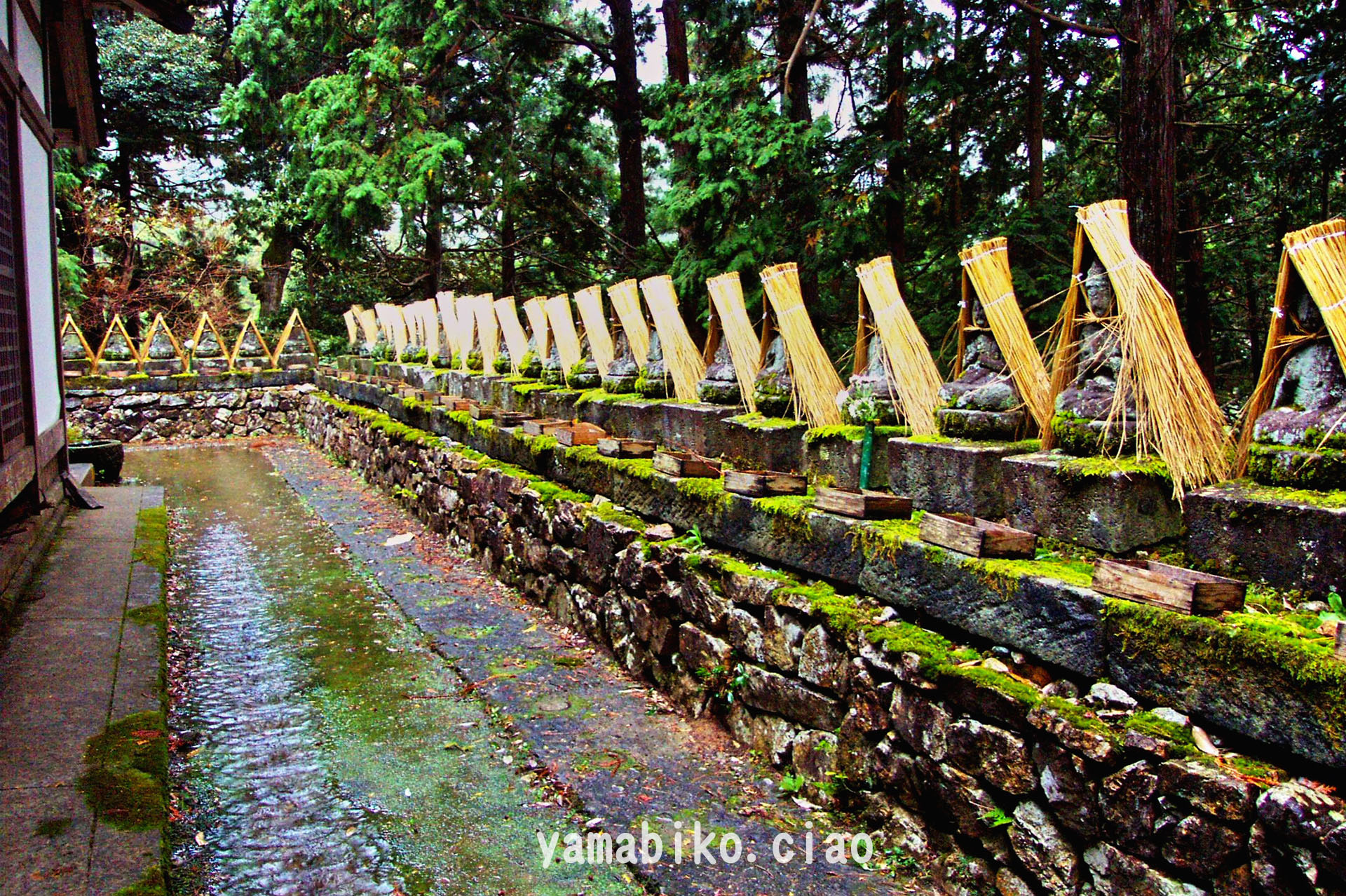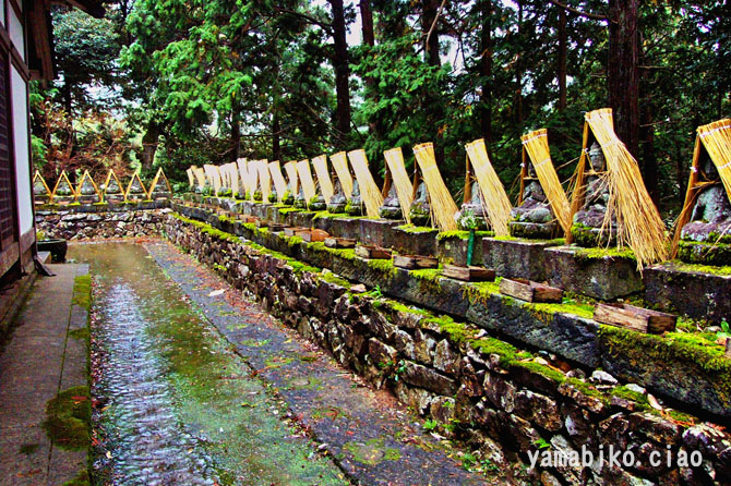 若狭瓜割公園の八十八体石仏、厳しい寒さを前にミノボッチ(蓑帽子)をかぶっていらっしゃる